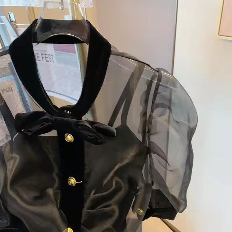 セクシーなスリム キャミソール トップス透視シャツ女性パフ半袖黒ガーゼ ブラウス 2 点セット ショート ブラック ハーフスリーブ asa38293804843