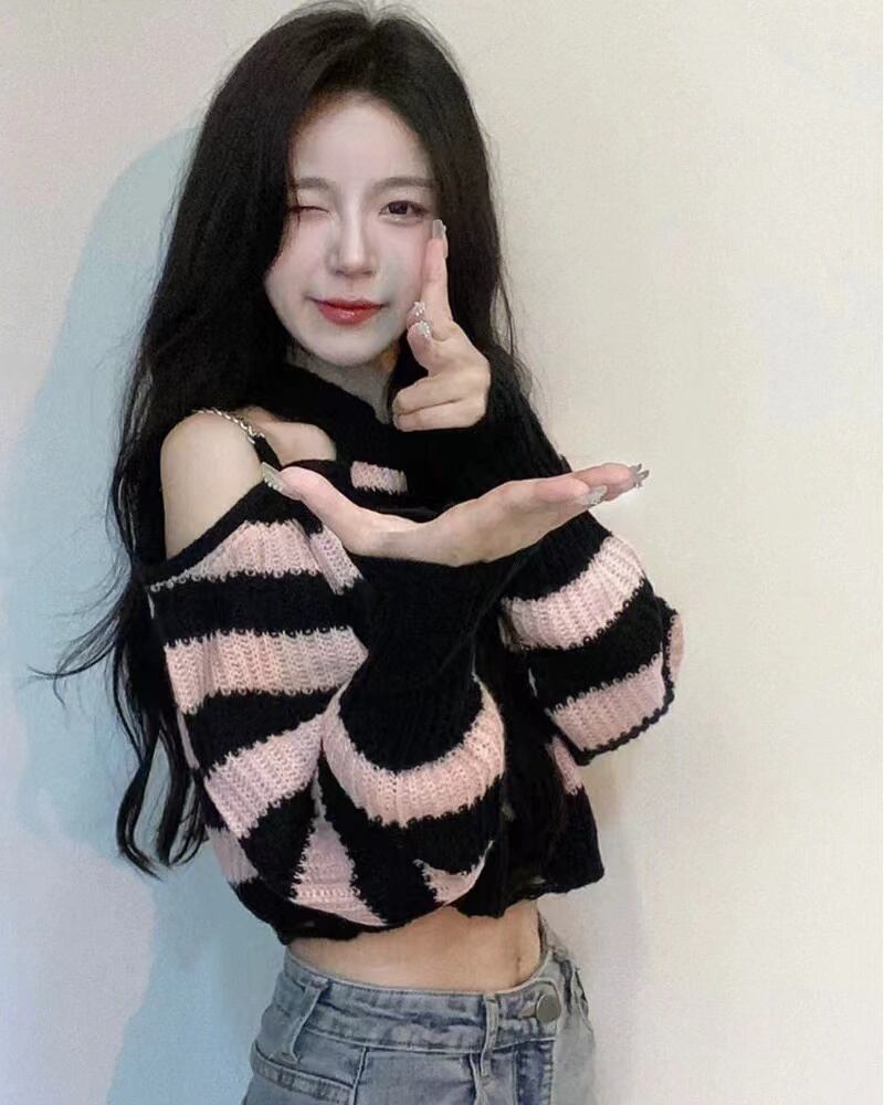 セクシーな Y2k 服チェーンオフショルダープルオーバー中空ピンクストライプセーターショートニットトップ女性ジャンパーセーター asa20082679435