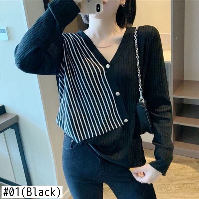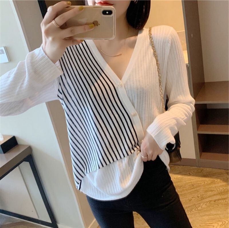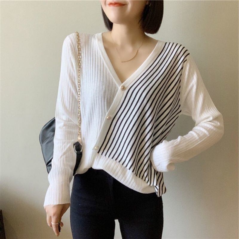 ルーズ V ネック黒、白のストライプのシャツの女性の野生の薄い不規則なカーディガン春ニットセータージャケットトップス ホワイト ブラック スプリング 春物 Vネック asa90471505953
