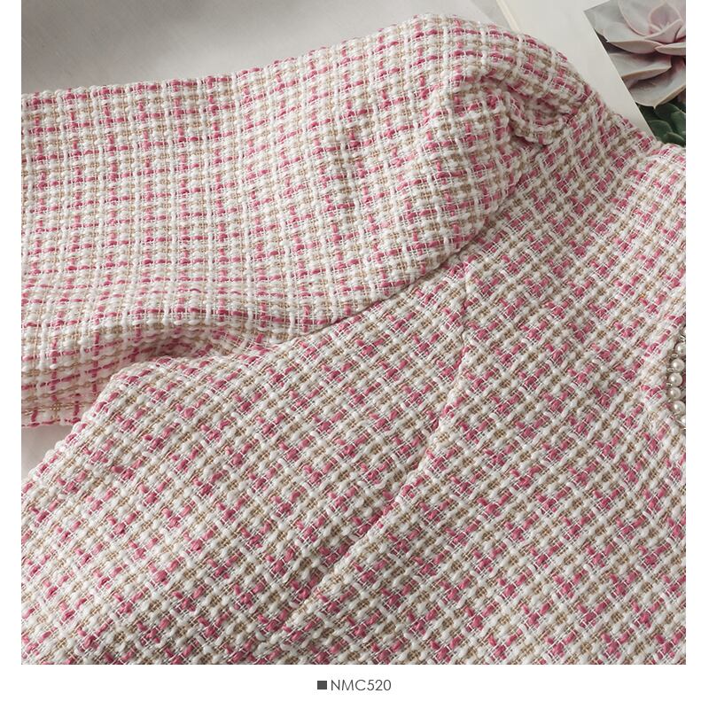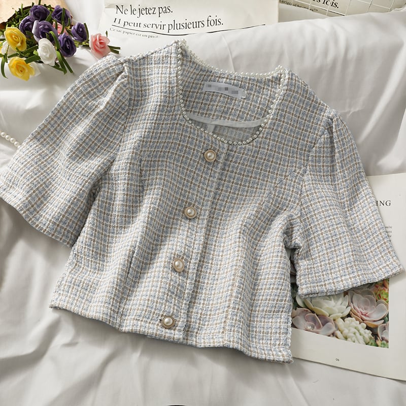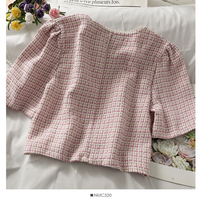 ビーズ O 半袖ツイード トップス シングル ブレスト カーディガン ジャケット ピンク チェック柄シャツ クロップ ボタン ブラウス レディー ショート ハーフスリーブ asa32025567086
