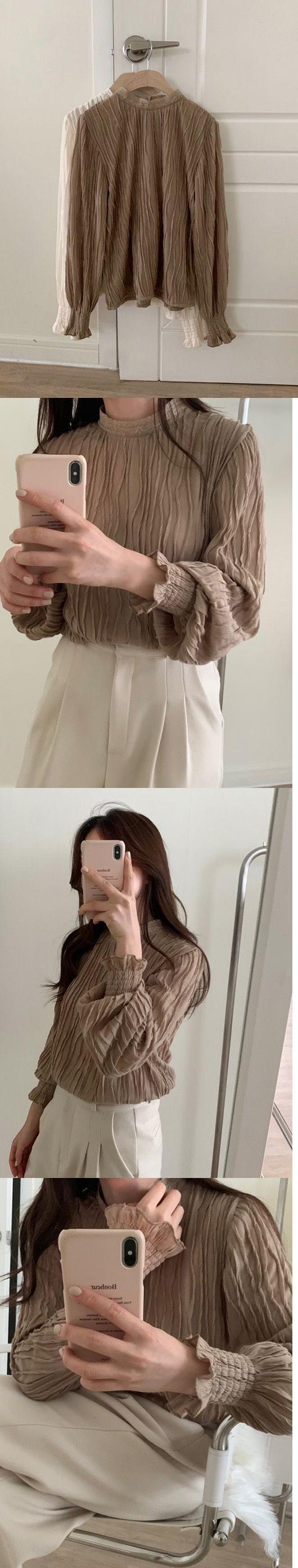 スタンドカラー ブラウス ルーズ トップス フリル ハーフプリーツ シャツ 長袖 シフォンシャツ レディース コート風 ロング asa93219825069