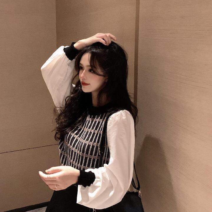スリムラップヒップボディコンロングチェック柄ドレス女性パッチワークフェイクツーピース Vestidos パフスリーブ O ネックニット秋 Oネック asa86075479795