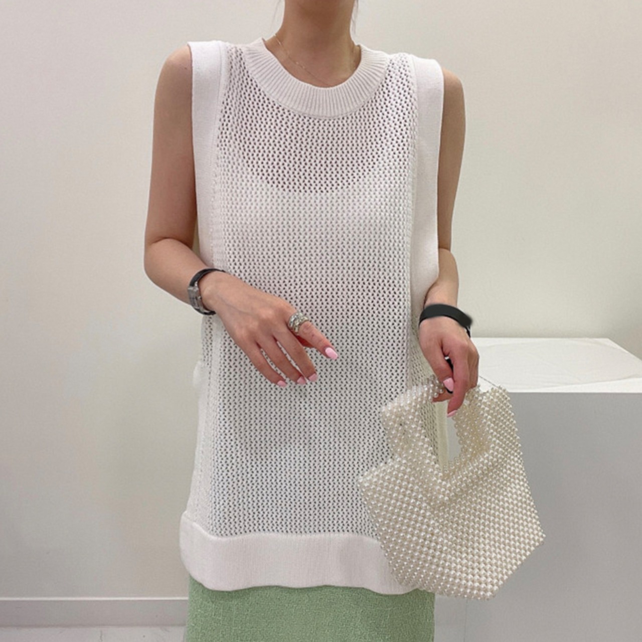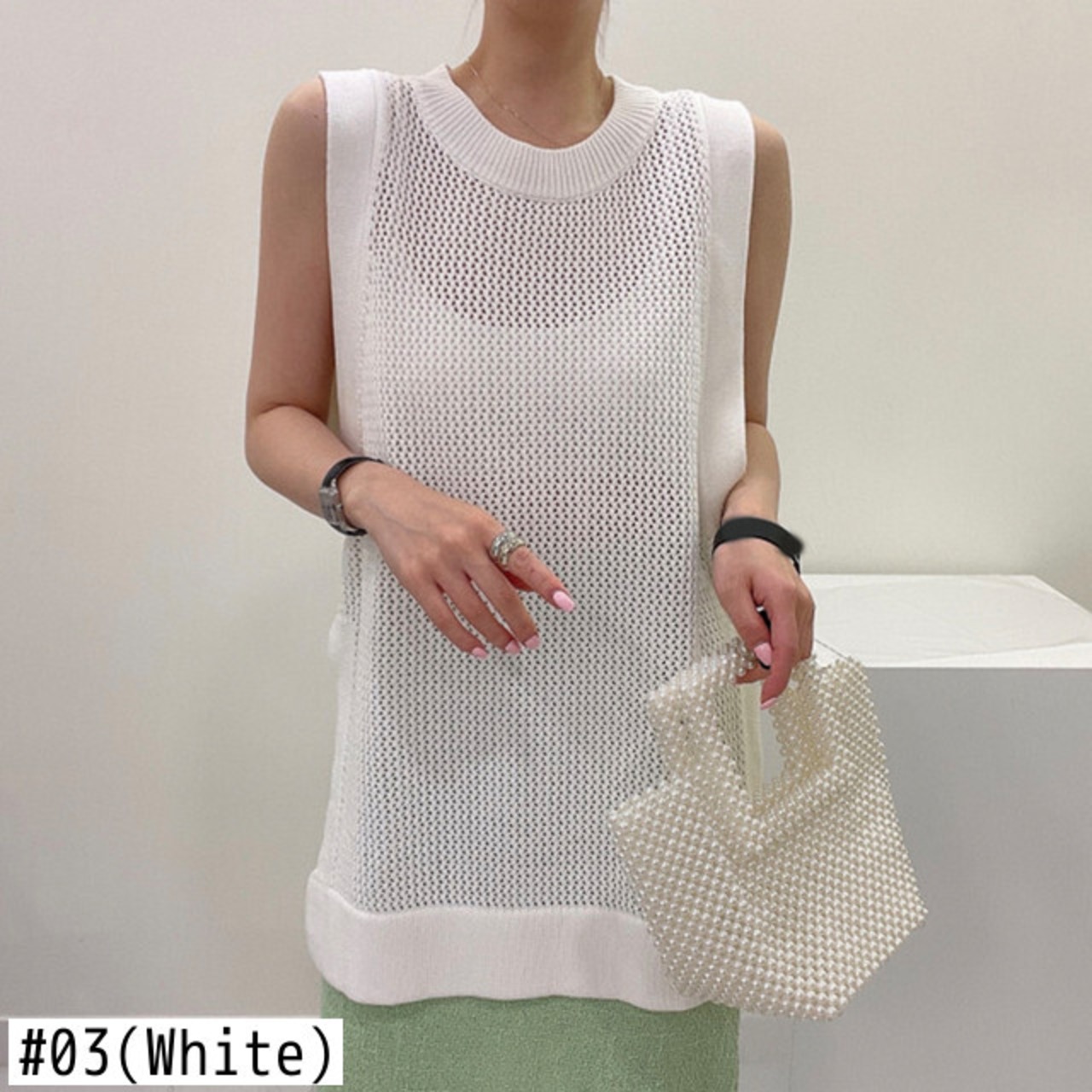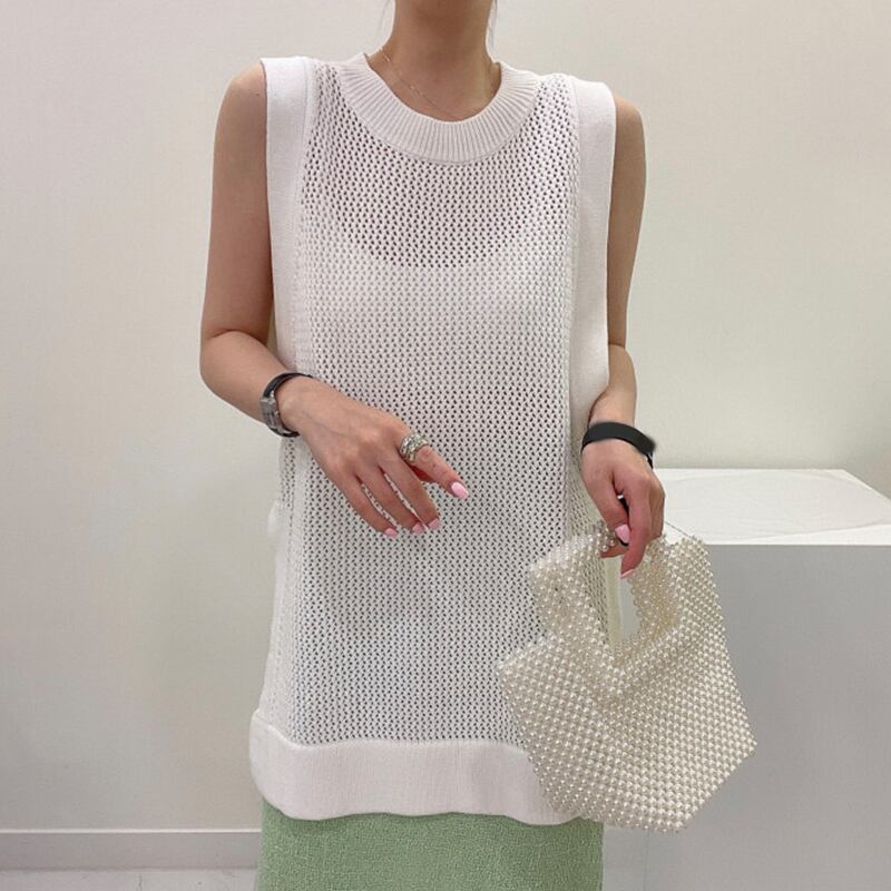 タンクトップキャミソール O ネック中空白透視ベスト女性緩い野生ノースリーブニットベストセーター Chalecos チョッキ ホワイト Oネック asa61644061697