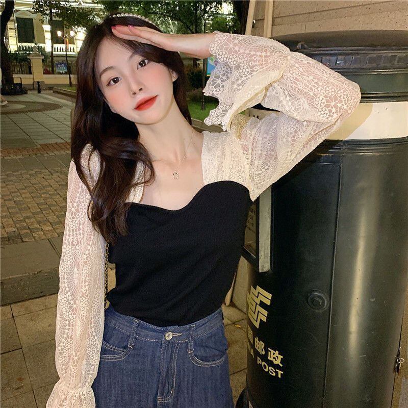 スリムセクシーなスクエアホワイトレースシャツ女性デモーダ春ニットトップスワイルドブラウス女性黒フレアスリーブ ブラック スプリング 春物 スクウェア asa65482789408