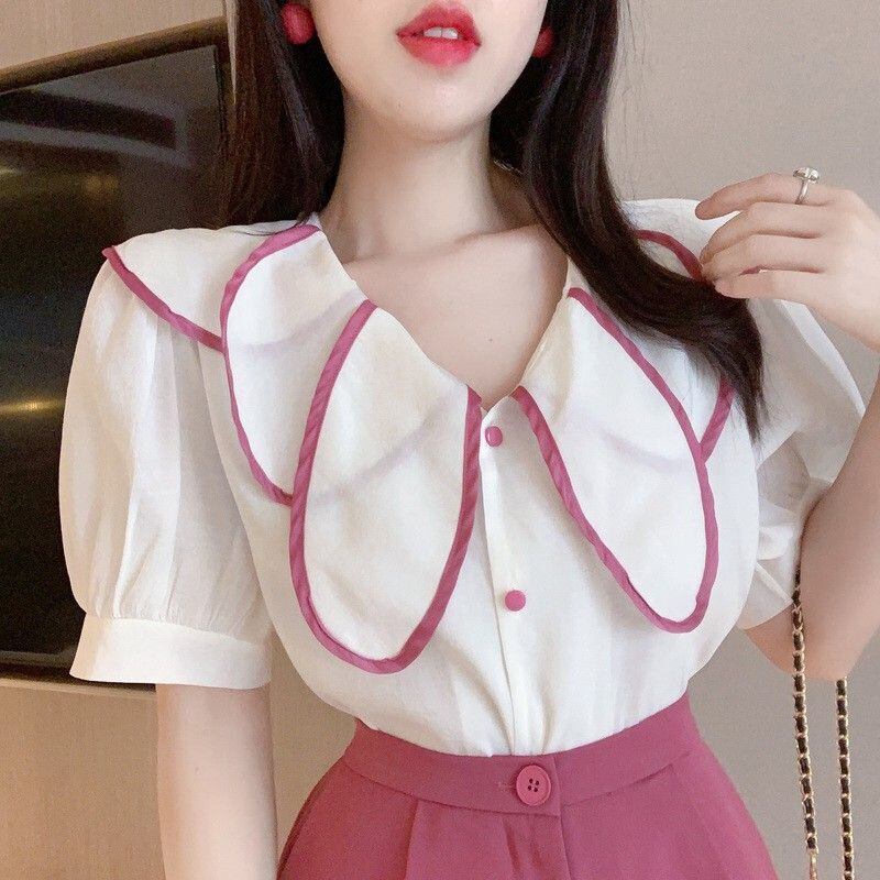 フレンチホワイトドールカラーシャツ女性シックなパフ半袖クロップトップス春夏ブラウススウィート ショート ハーフスリーブ 大人ガーリー キュート カジュアル スプリング 春物 サマー 夏物 asa78771159730