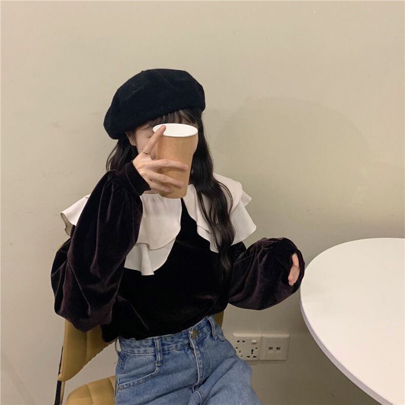 二重層フリル襟トップス カミーサ デ モーダ長袖黒ベルベット シャツ女性ブラウス シャツ ロング ブラック asa45541918303