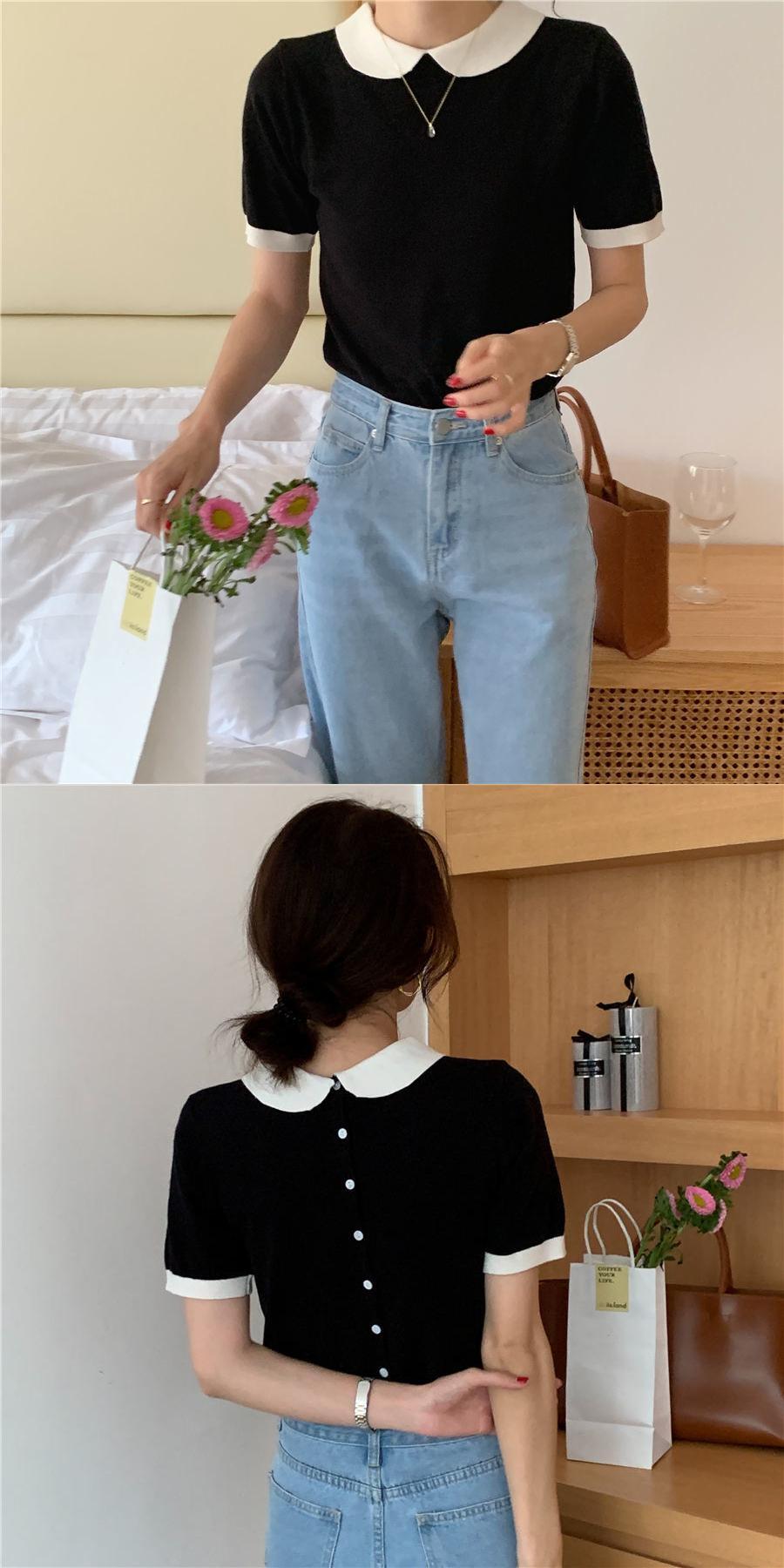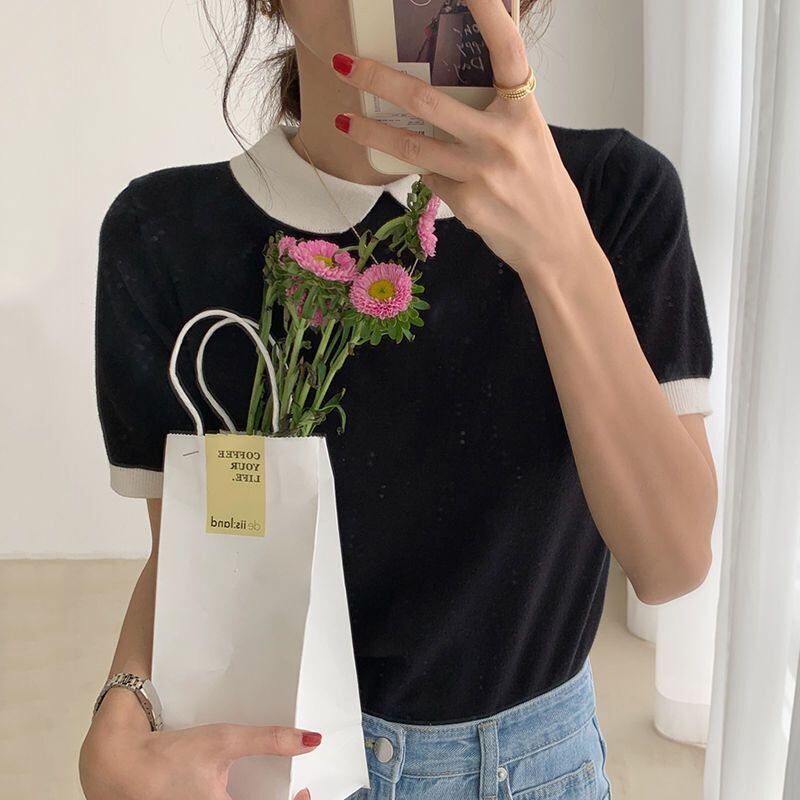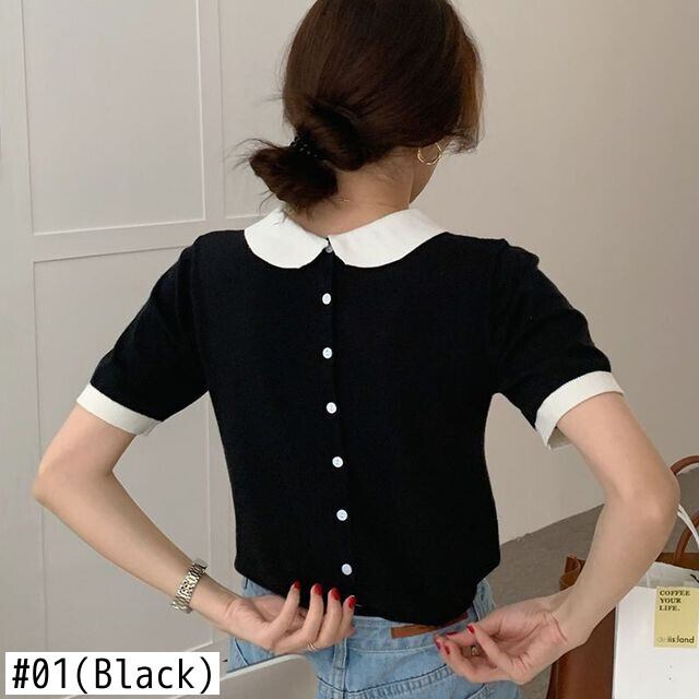 シングルブレスト ブラック ドールセーター パフ 半袖 襟 ワイルド スリム ストレッチ ニット トップス ジャンパーシャツ レディース ブラウス ショート ハーフスリーブ asa34991043907
