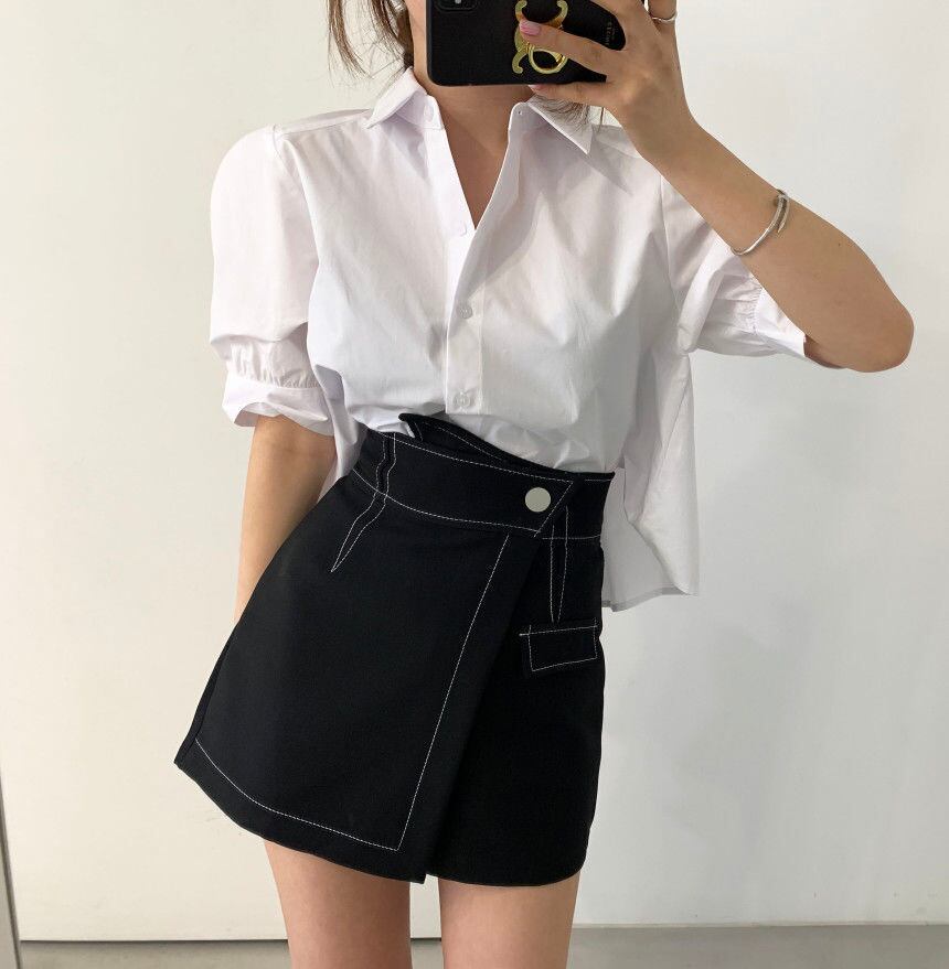 プリーツ ルーズ ホワイト ドール シャツ パフスリーブ ラペル ブラウス レディ ワイルド カミサ デ モーダ ブルー イレギュラー シャツ asa73419342908