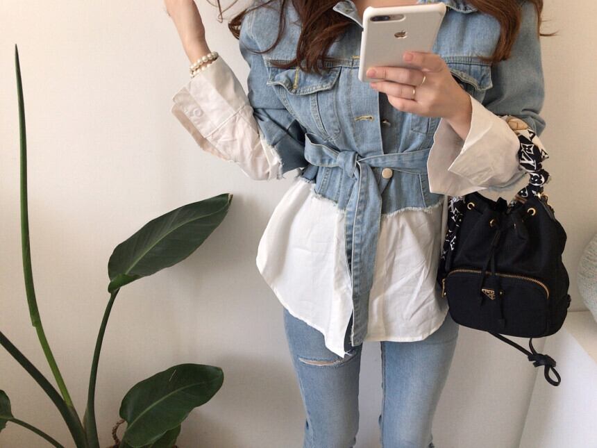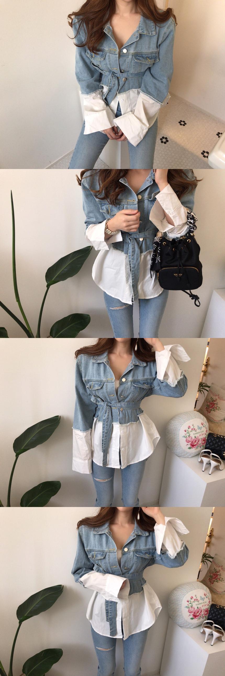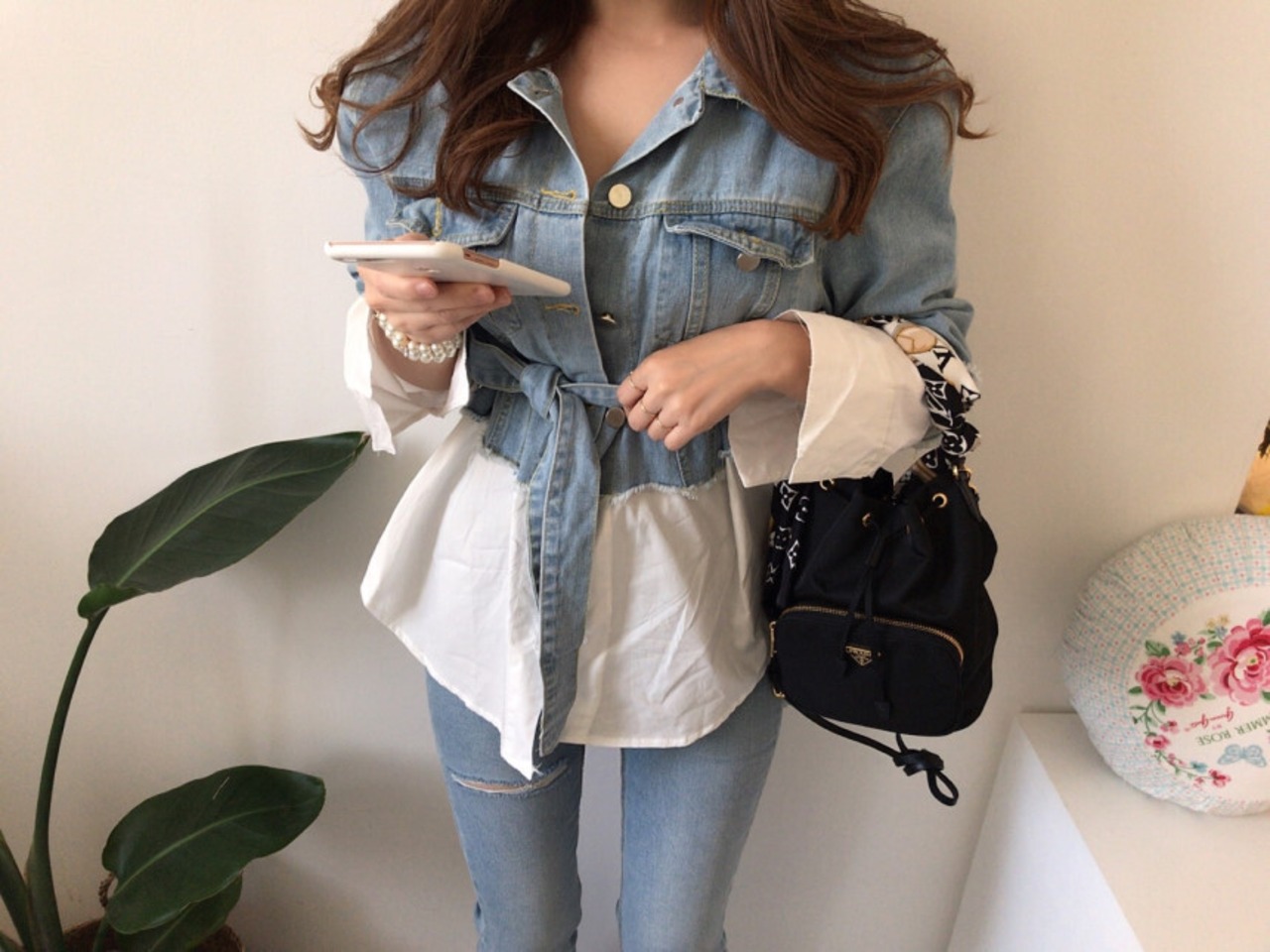 ステッチフェイクツーピースラペル長袖シングルブレストスリムウエストレースアップデニムコート女性ジャケットサッシュ ロング asa9546581193