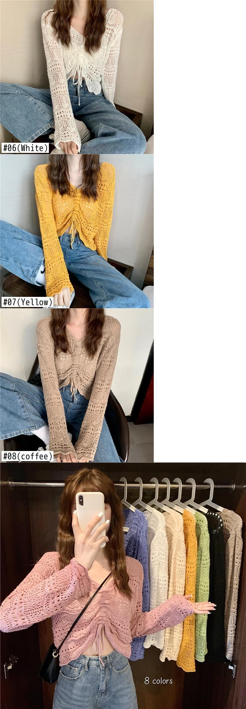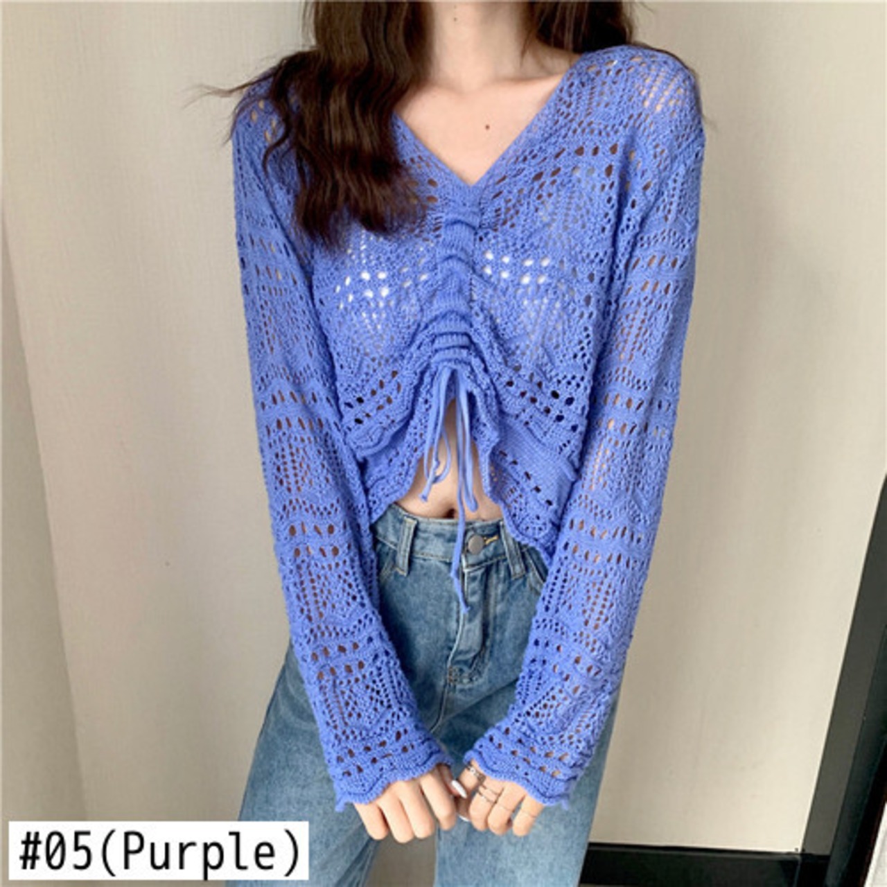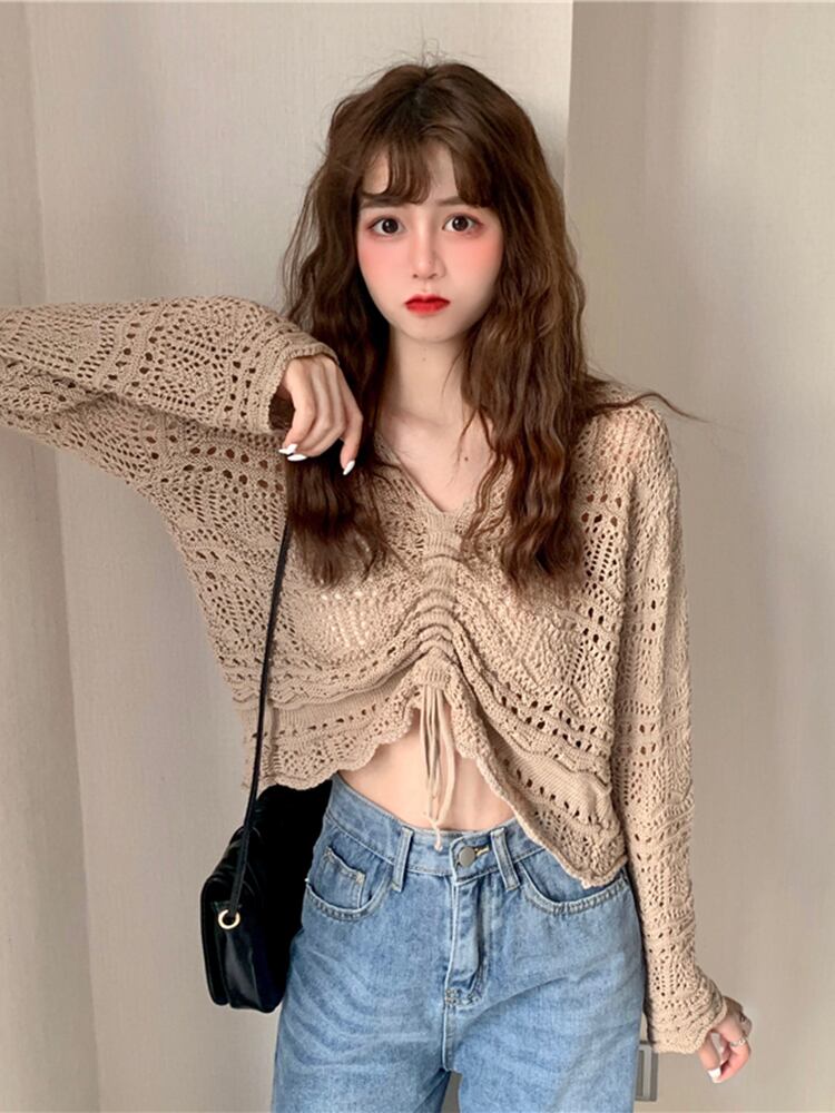 日焼け止め V ネックルーズ中空ニットトップス薄いルーズ巾着 Tシャツソリッドピンク Tシャツ Tシャツ女性 Vネック ソリッドカラー asa15994948389