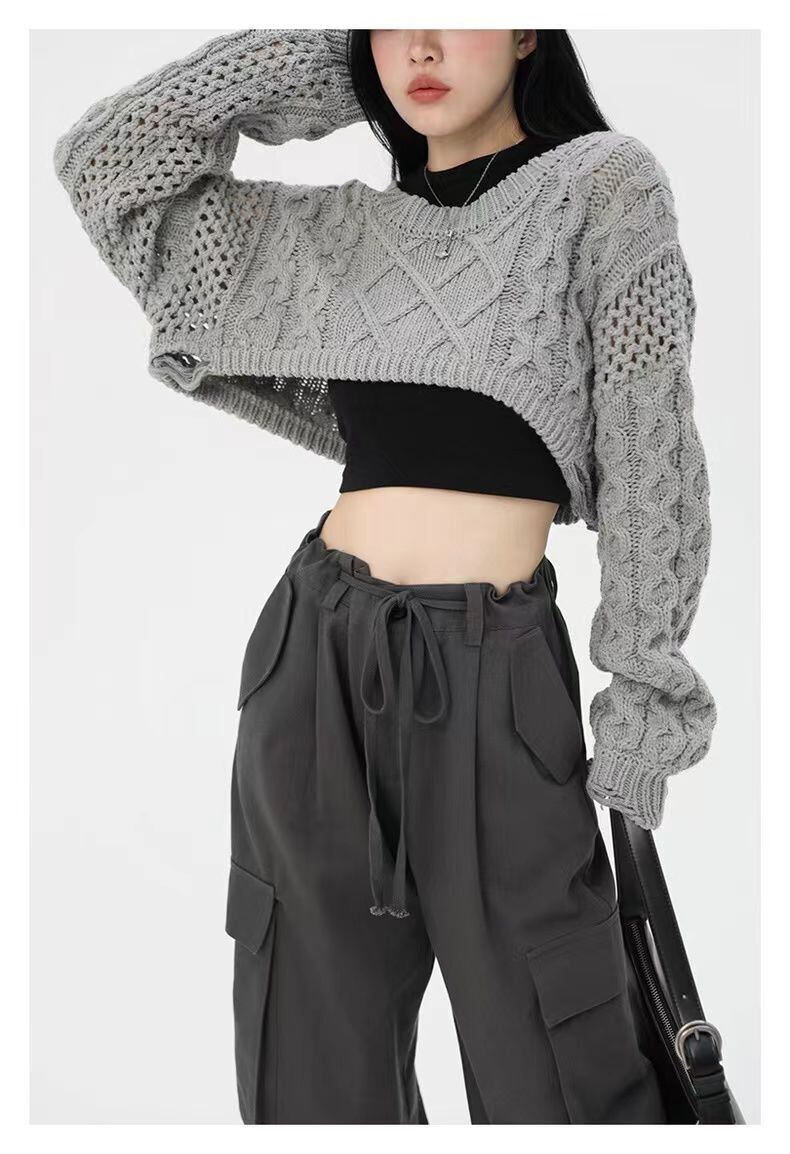 初秋中空アウトショートジャンパー O ネック長袖セーター女性原宿固体プルオーバー Y2k トップ ロング かわいい オータム 秋物 Oネック ソリッドカラー asa25443861384