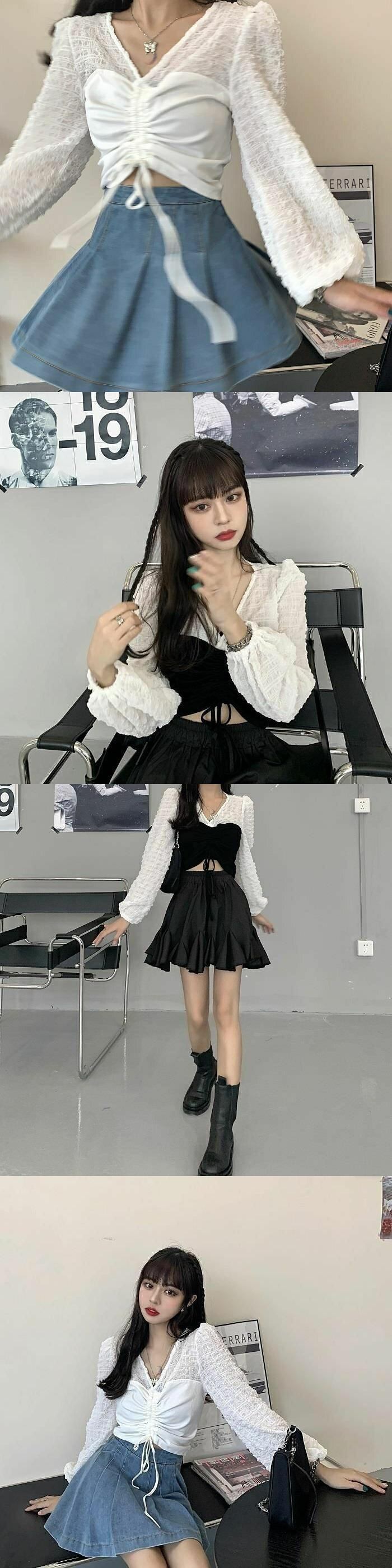 パフスリーブショート巾着長袖シャツ女性トップスリムセクシーな黒、白のコントラストブラウスセクシーなクロップシャツ ロング ホワイト ブラック asa37010853329