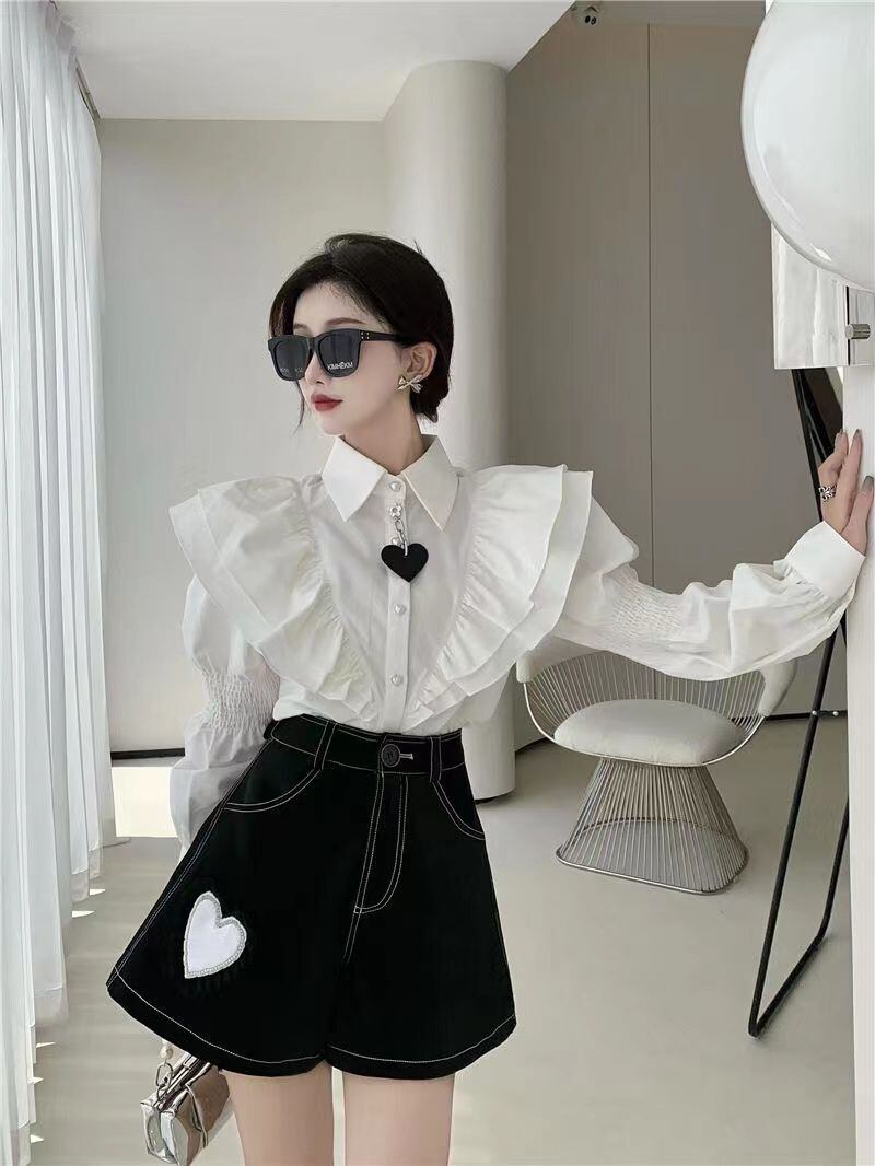 De Moda 白シャツ女性長袖フリルルーズ春トップスラペルシックなボタンシャツブラウス ロング ホワイト スプリング 春物 asa96968140795