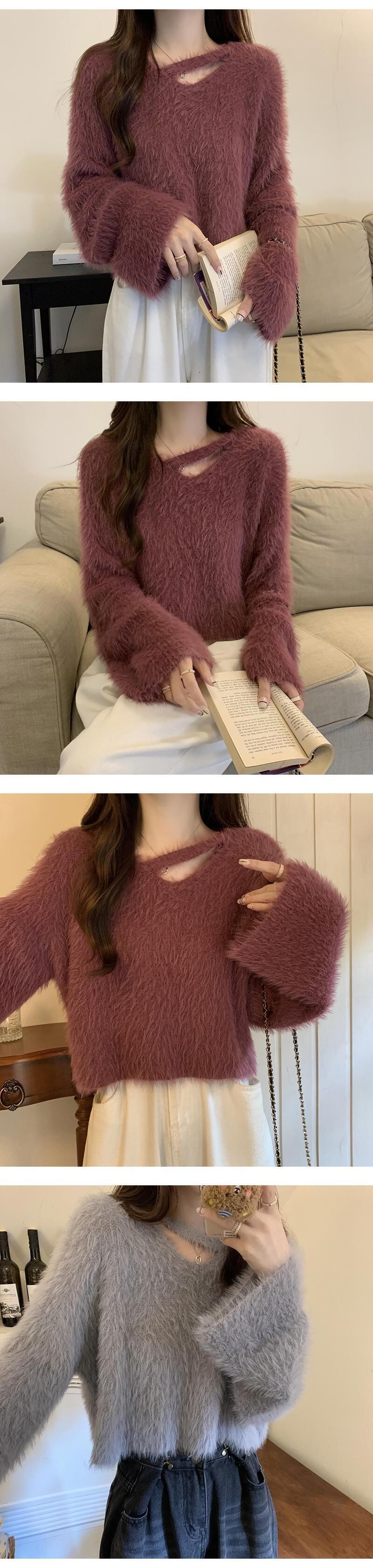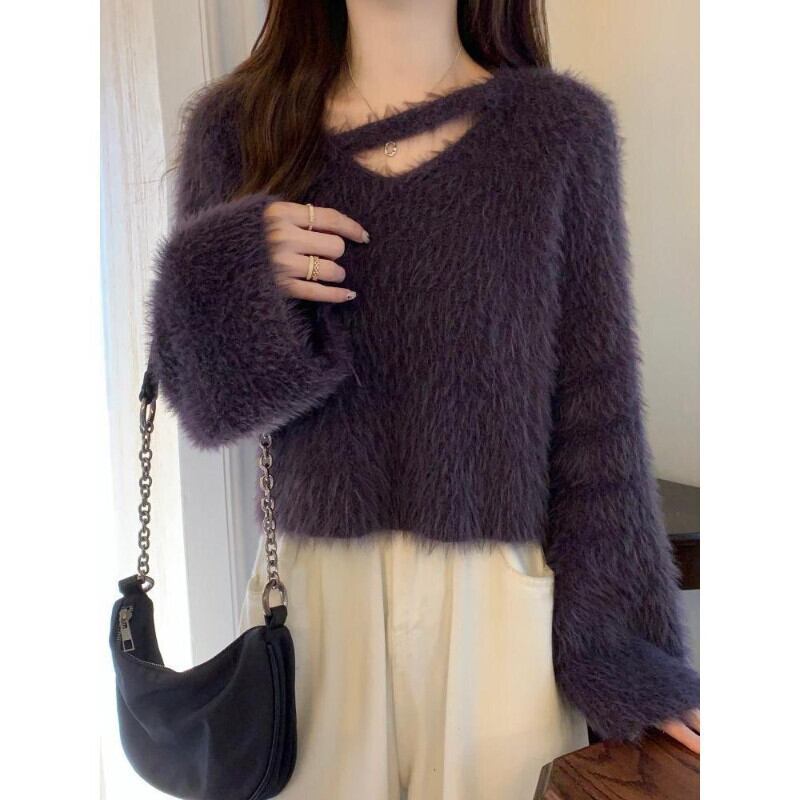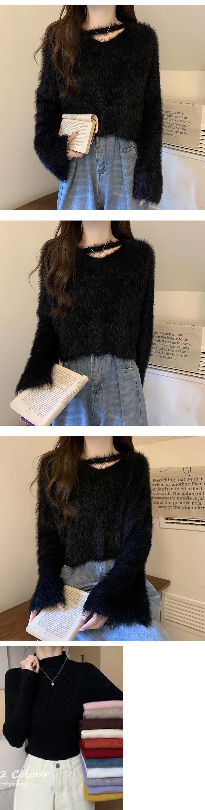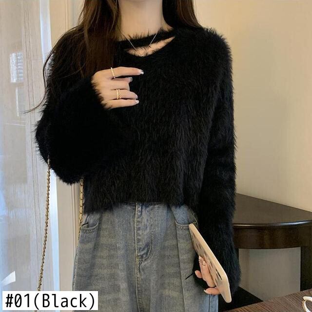 ミンクカシミヤモヘアセーター O ネック長袖無地ジャンパー黒セーター女性春ニットトップスシャツ ロング ブラック スプリング 春物 Oネック ソリッドカラー asa69610143023