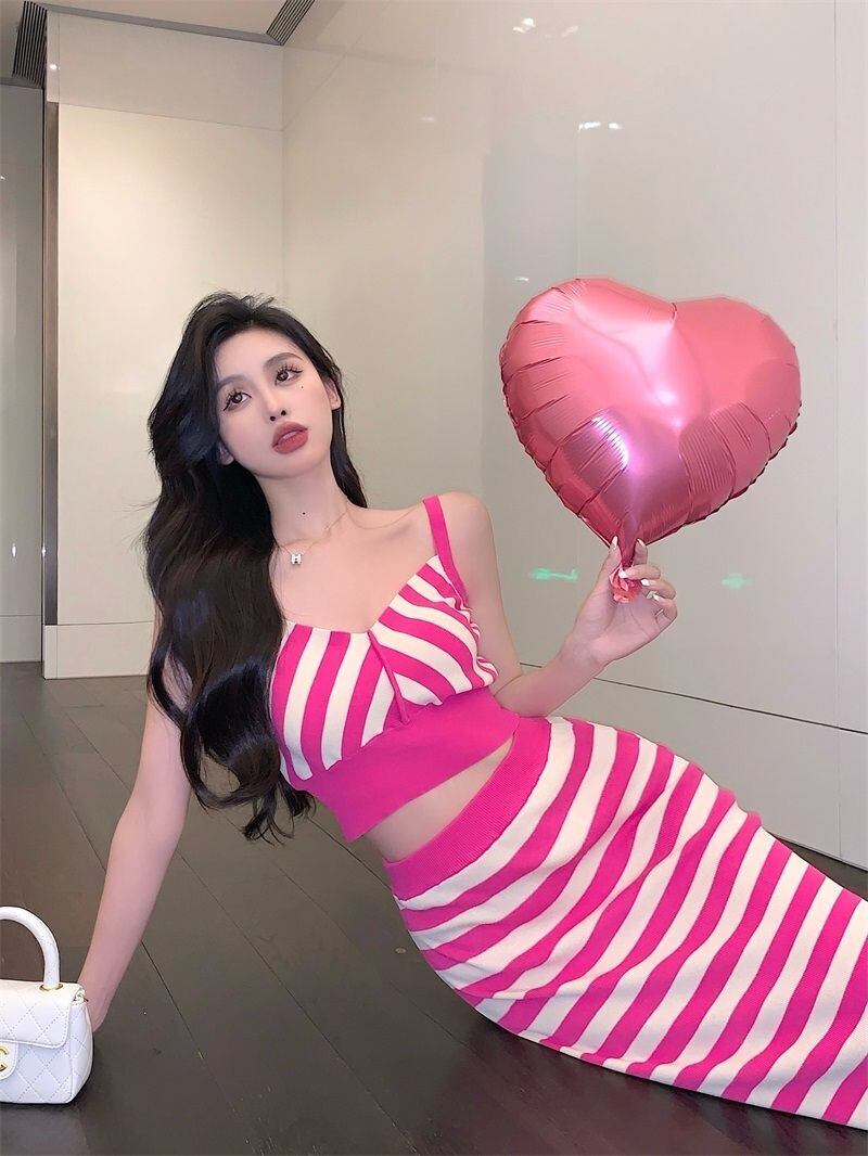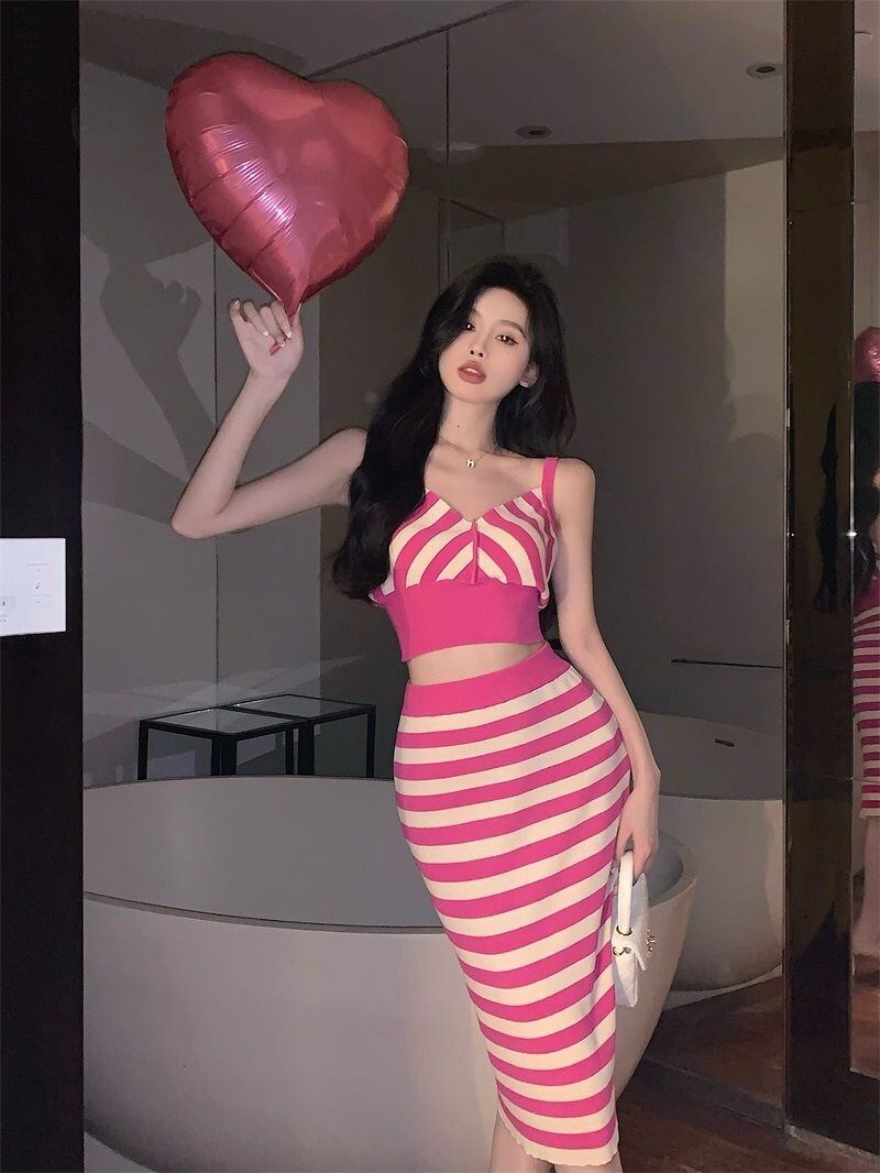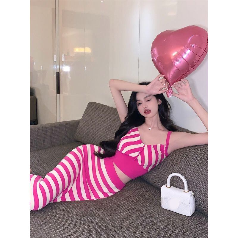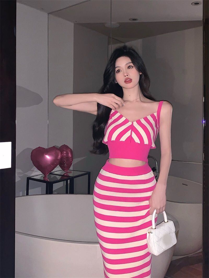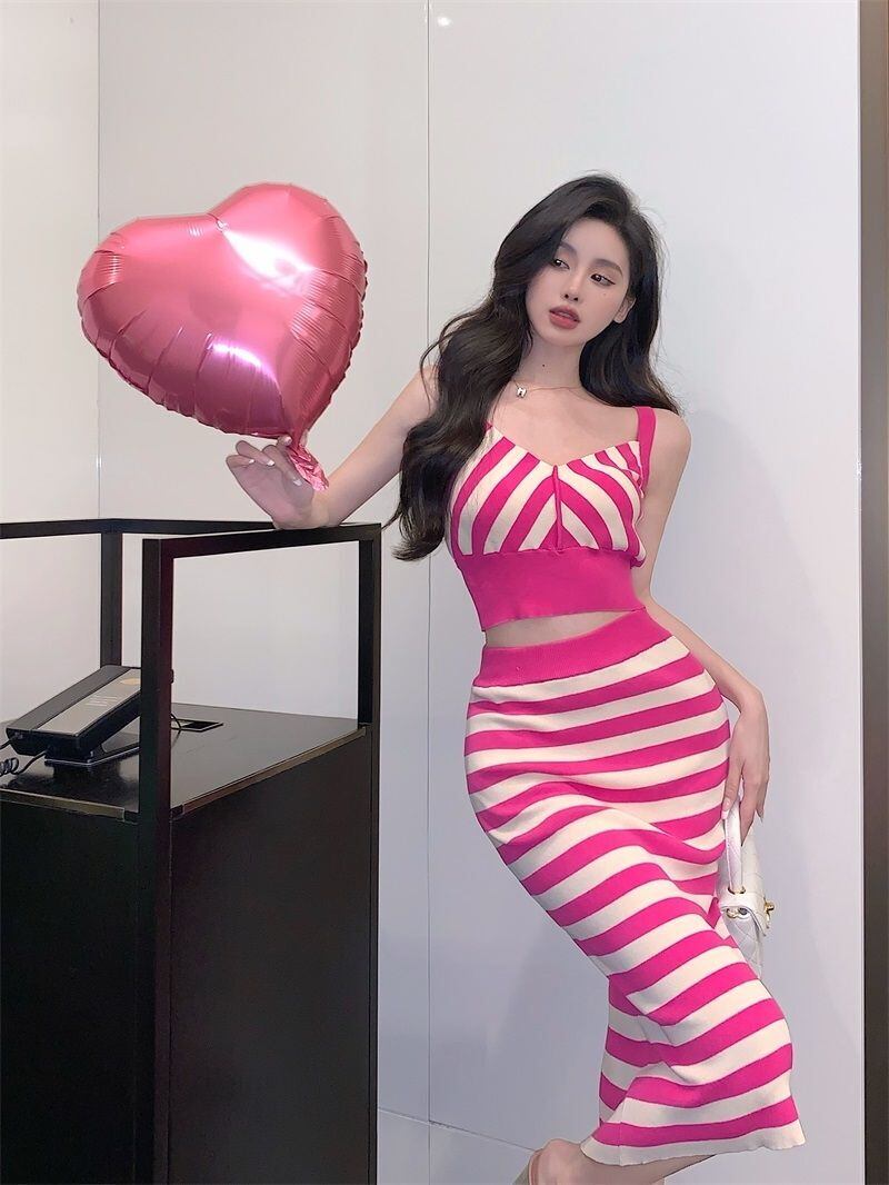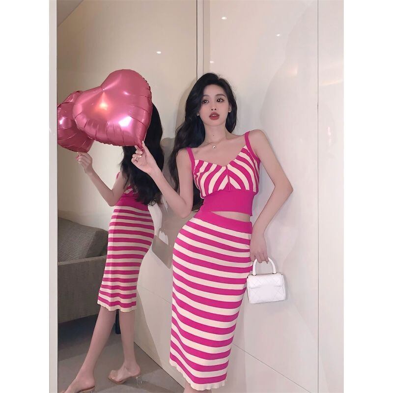ノースリーブ スリム ニット キャミソール タンク トップス a ライン ストライプ スカート セクシー な ツー ピース セット女性春夏y2k ドレス スーツ スプリング 春物 サマー 夏物 Aライン asa85656266589