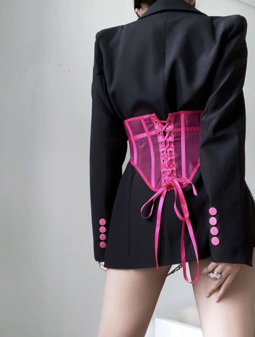 ショルダーパッドブラックテーラードコート春女性ブレザースーツジャケット + 不規則な包帯ピンクベルト Y2k トップス レッド スプリング 春物 ハーネス asa93283222928