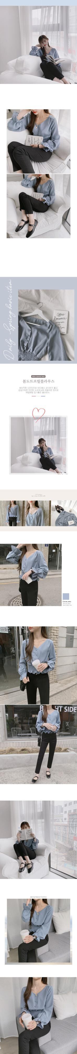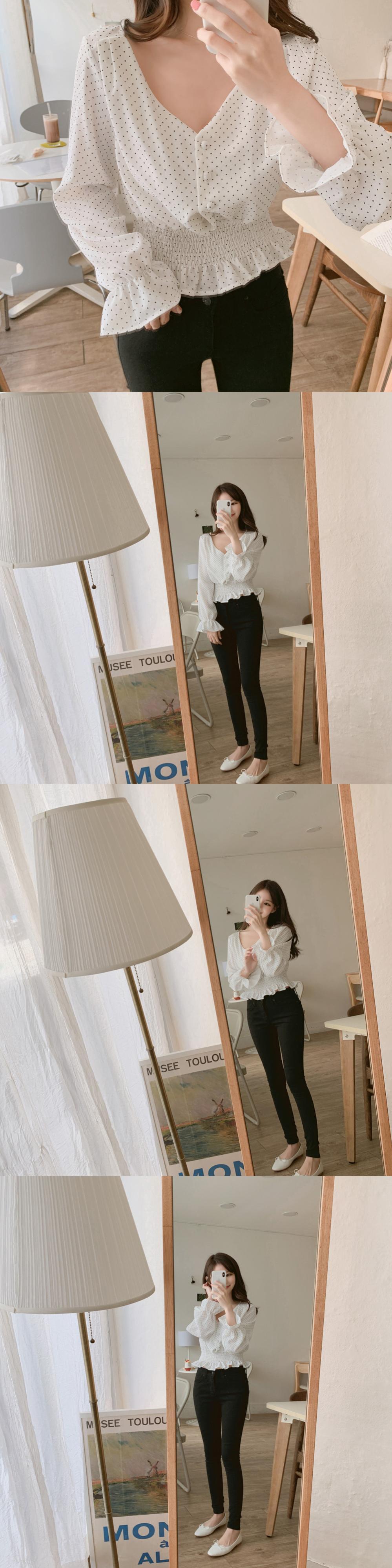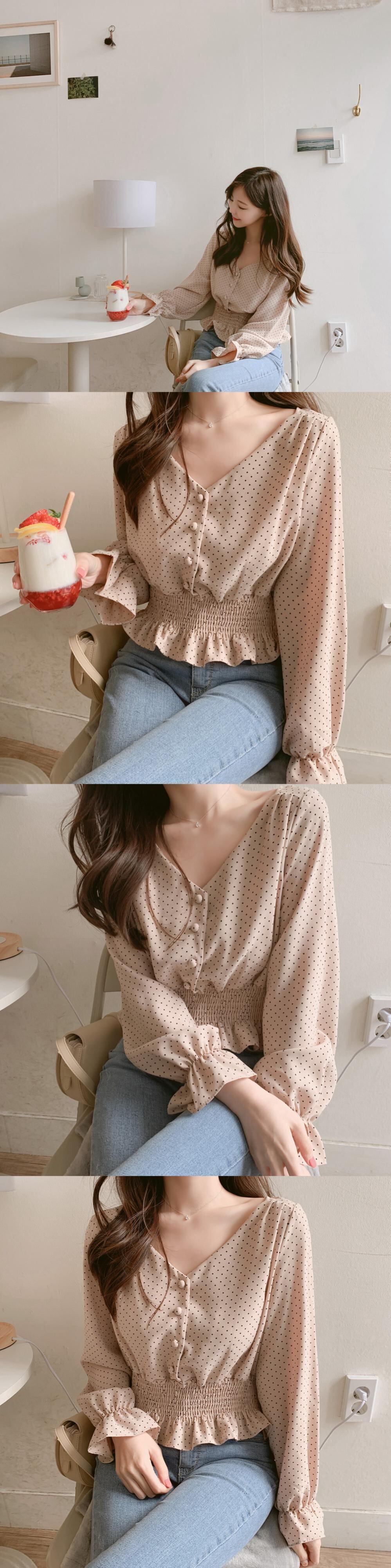 V ネック弾性ウエスト フリル フレア スリーブ ポルカ ドット シャツ女性レトロ オフィス レディー トップス ブラウス クロップ フレアスリーブ エラスティック 伸縮 Vネック 会社 学校 通勤や通学にも asa56456650459
