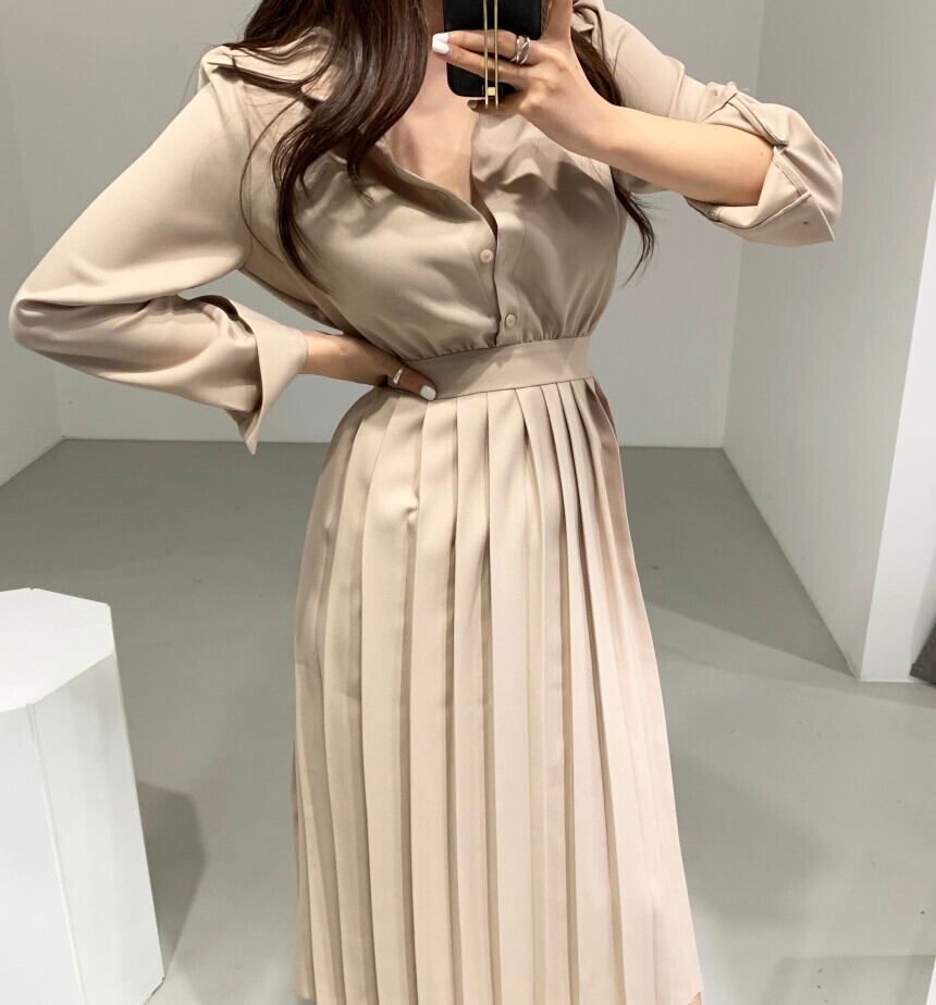 ウエスト A ラインカーキプリーツシャツドレス女性春秋のセクシーなドレス Vestidos デラペルフルスリーブローブ スプリング 春物 オータム 秋物 Aライン asa10154635934
