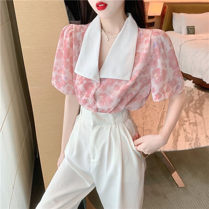 ラペルピンク花シャツ女性デモーダパフ半袖トップスオフィスレディシフォンシャツ甘いスーツ ショート ハーフスリーブ 大人ガーリー スウィート キュート カジュアル 花柄 会社 学校 通勤や通学にも asa78228236903