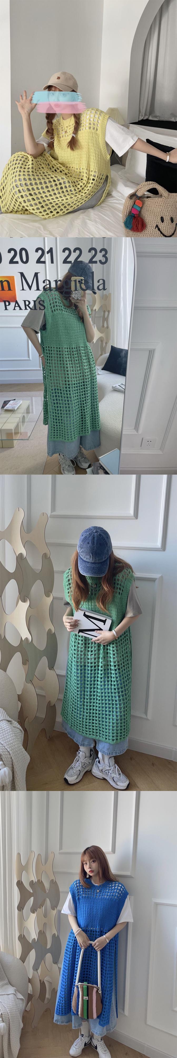 ルーズ O ネックノースリーブベストドレス女性中空ニットメッシュ Vestido ローブロングドレスセーターベスト無地 Oネック ソリッドカラー asa82141492747