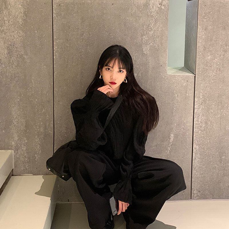 長袖黒シャツ女性ルーズトップスプリーツブラウスシャツ女性パフスリーブ ロング ブラック asa55725927739