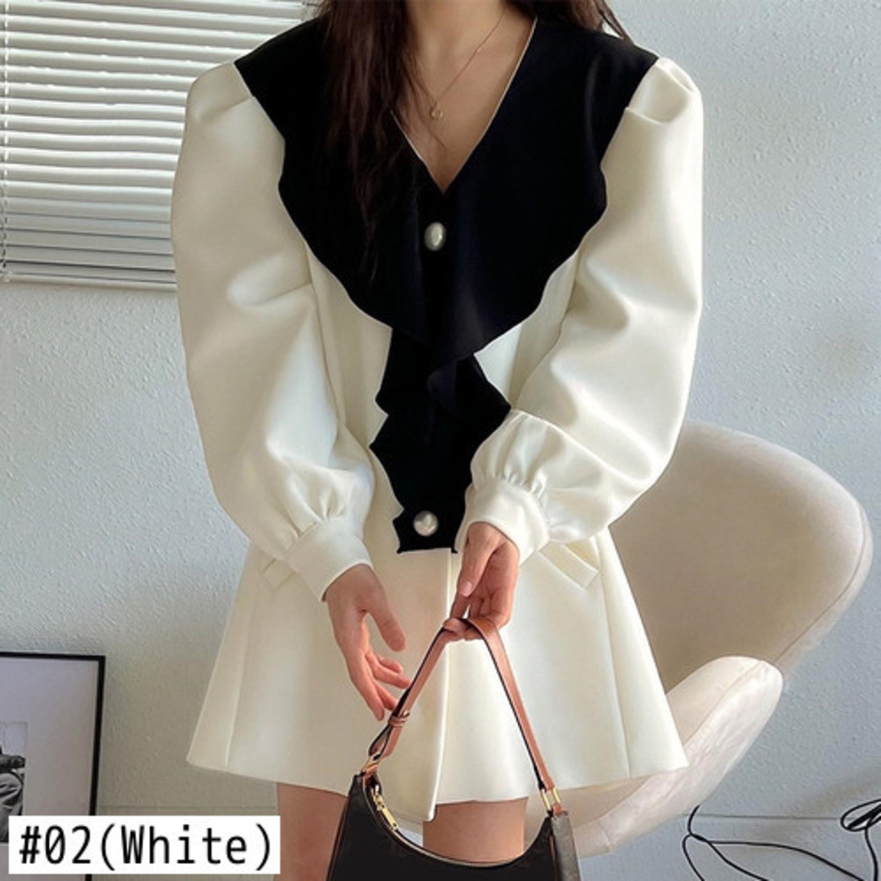 Vestidos コントラスト フリル襟パール ボタン ルーズ パフ長袖ドレス女性スーツ Y2k ドレス人形 ロング 真珠 asa85898047899
