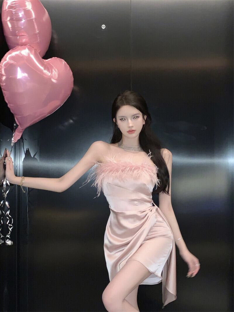 スリムセクシーなスラッシュオフショルダーストラップレスラップヒップピンクの羽ドレス女性不規則なパーティーローブ Vestidos ミニサテン asa77008559284