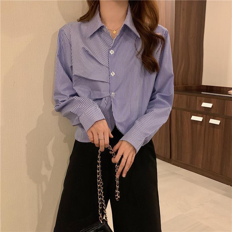 ブラウス女性春ワイルドホワイトシャツ女性ラペルブルーストライプシャツ長袖トップスオフィスレディ ロング スプリング 春物 会社 学校 通勤や通学にも asa24467587339