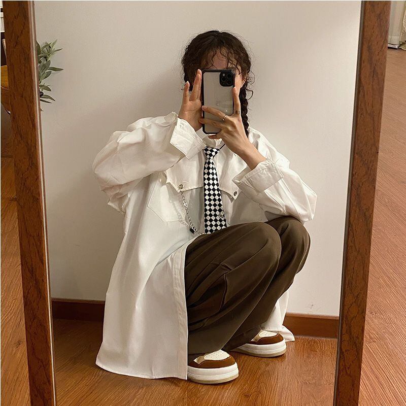 長袖チェスボードタイシャツブラウストップスルーズスタイルJKシャツチェーン白シャツ女性 ロング ホワイト asa28605429540
