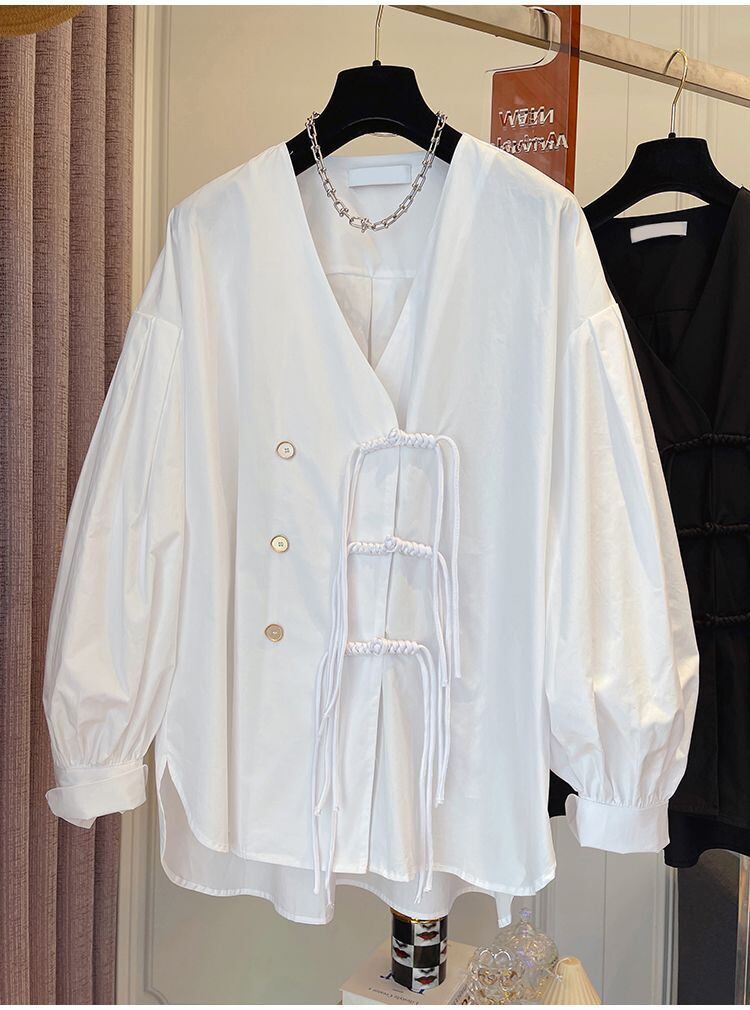 ルーズ V ネック中国風の Tel ボタンシャツ女性黒ブラウストップスシックな女性シャツジャケット ブラック Vネック asa34642195022