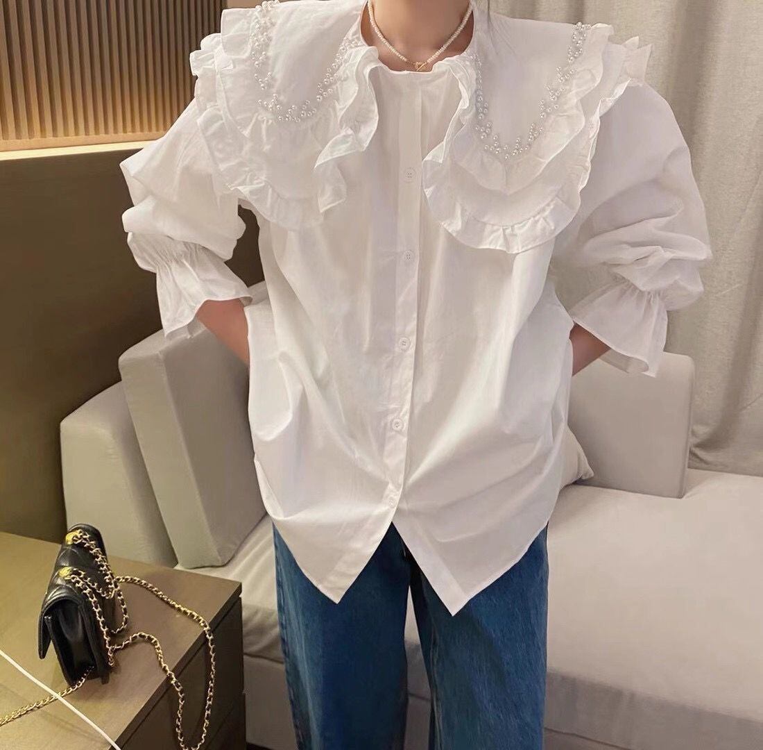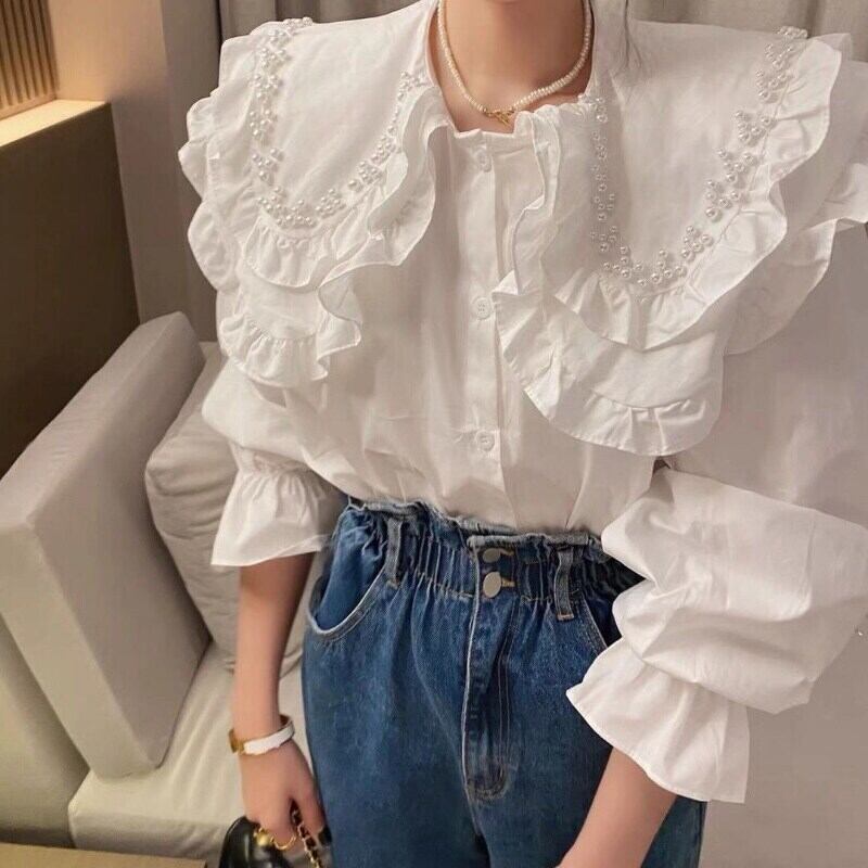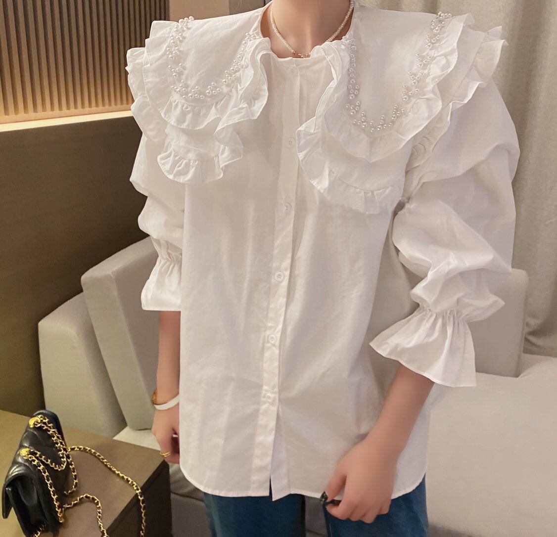 ルーズロングスリーブホワイトシャツ女性ビーズブラウス女性デモーダ人形トップス 長袖 asa28355524437