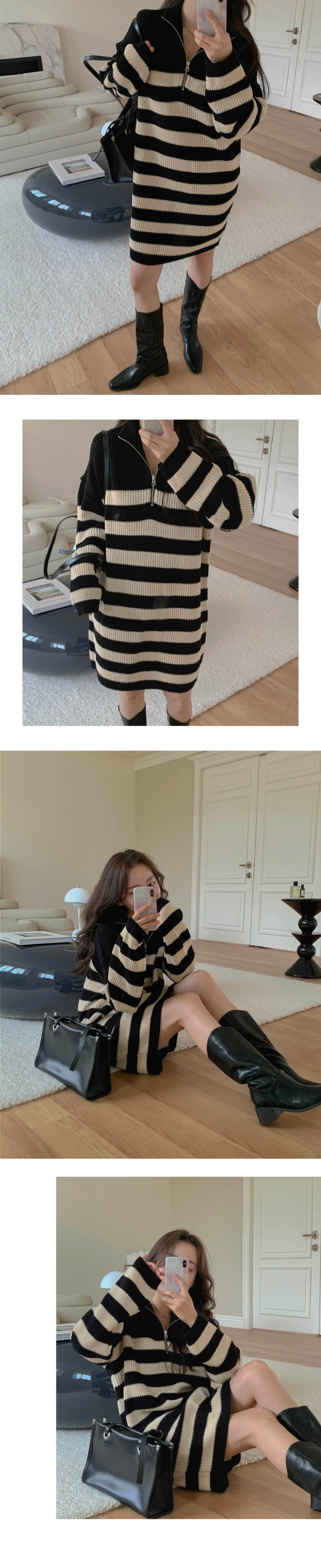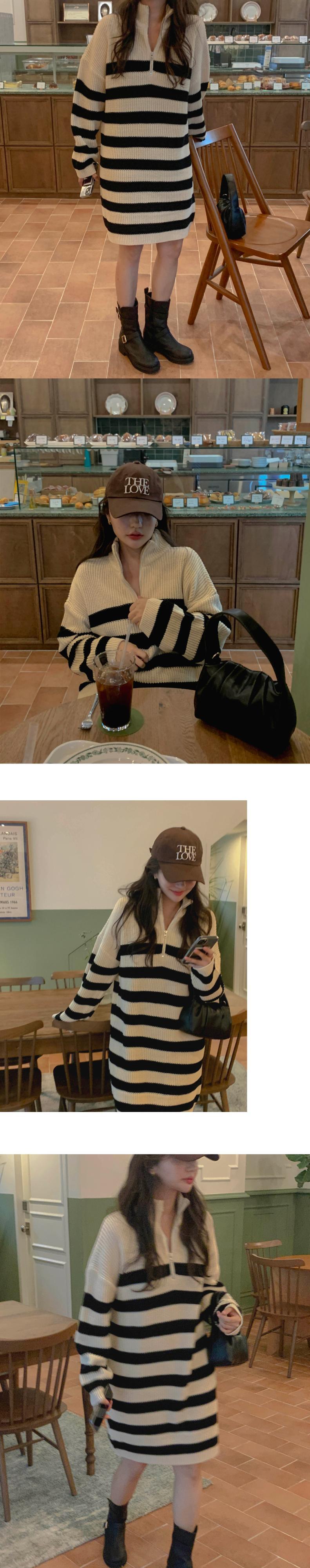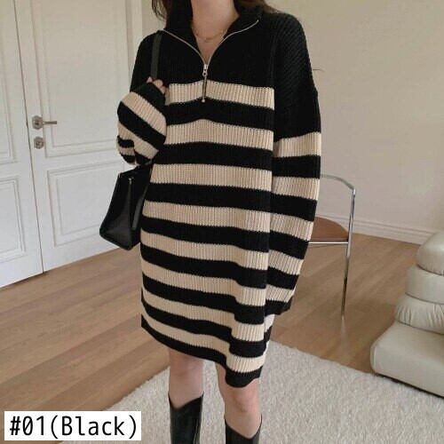 ルーズハーフジッパーニットドレス秋長袖黒、白のストライプのセータードレス女性 Vestidos デミニ ロング ホワイト ブラック オータム 秋物 asa3213392282