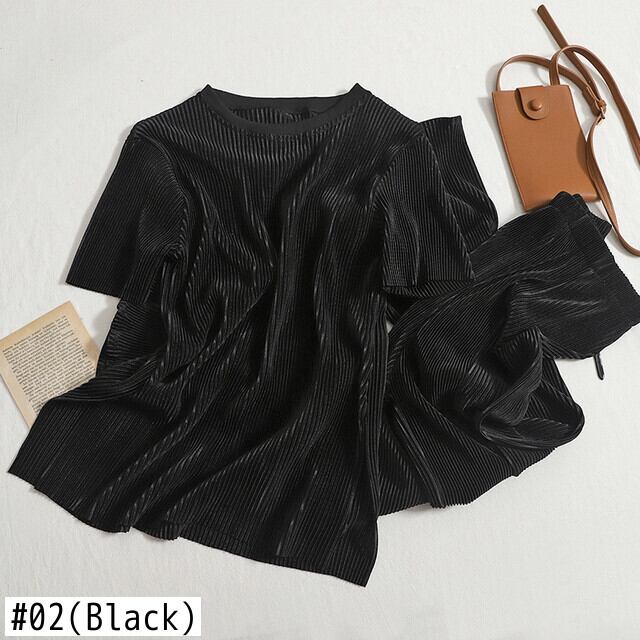 スーツ Oネック Tシャツ 半袖 トップス ウエストスリット ワイドレッグ パンツ 2点セット 春 夏 ワイルド プリーツ 無地 ショート ハーフスリーブ スプリング 春物 サマー 夏物 ワイドパンツ ソリッドカラー asa31735210409