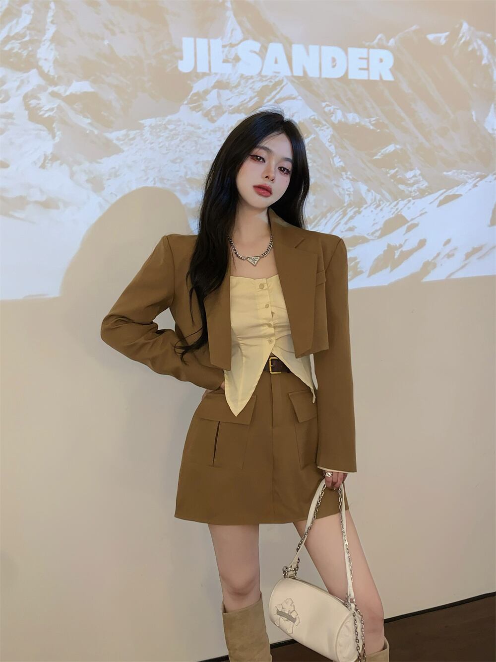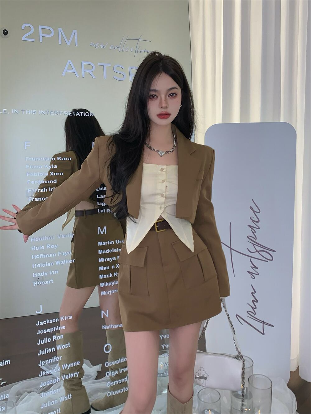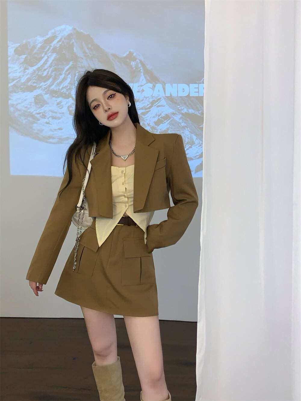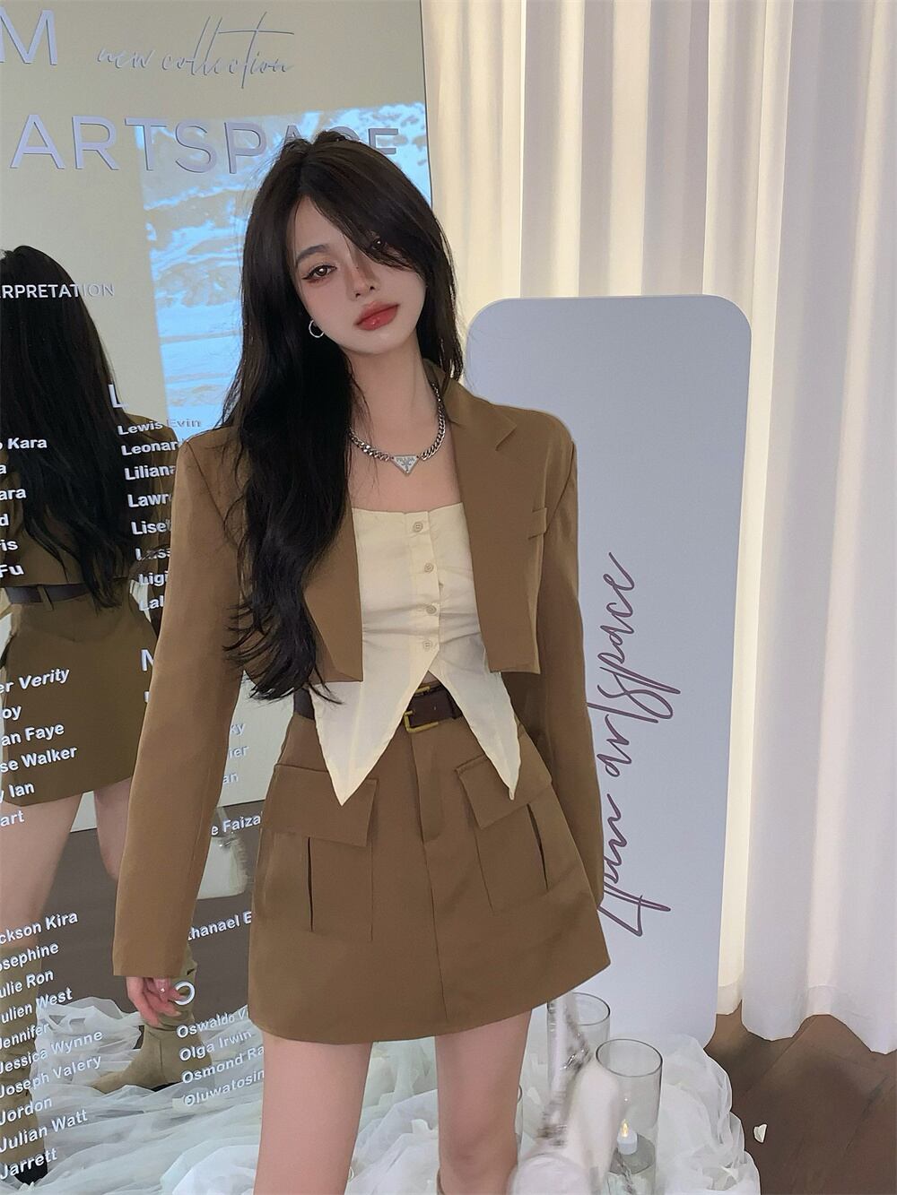 春ショートスーツコートカーキ不規則なシャツ女性のセクシーなベルトウエスト黒スカート 3 点セットブレザージャケットトップス ブラック スプリング 春物 ハーネス asa65290371006
