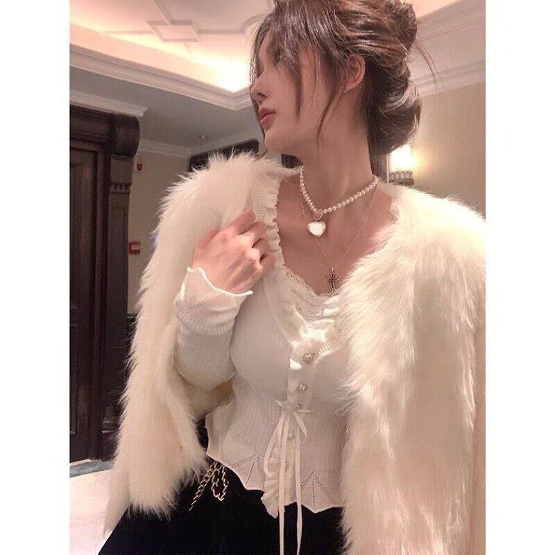 セクシーなフェイクツーピースセーター長袖レースシャツスウィートセーターピンクニットカーディガンクロップトップスレースアップパールボタン ロング 大人ガーリー キュート カジュアル 真珠 asa75650222025