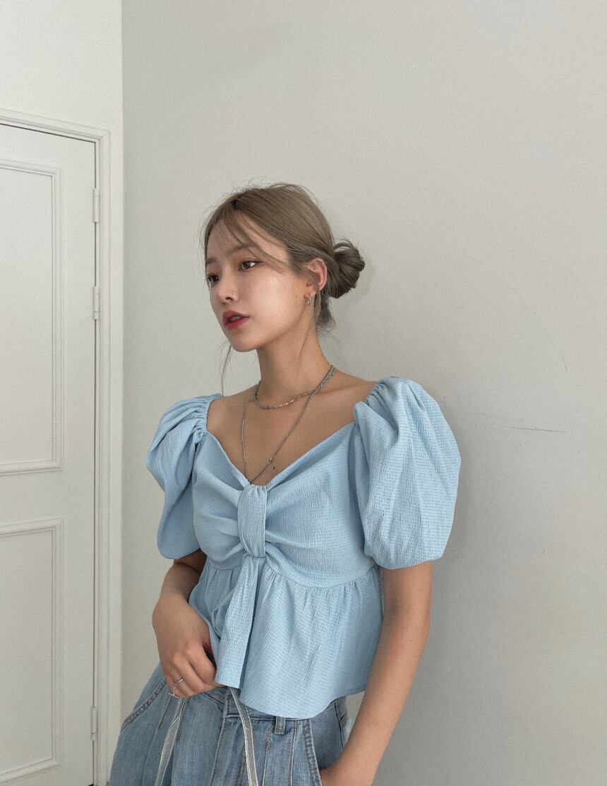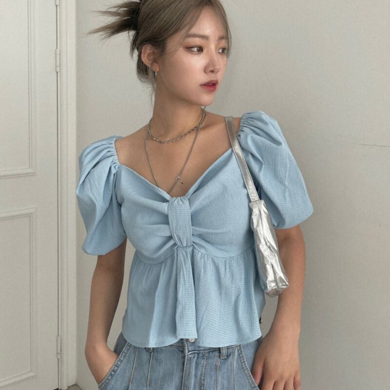 De Moda Vネック パフ 半袖 ショート フリル シャツ 蝶結び セクシー ブラウス スウィート ese Y2k トップス シャツ リボン ハーフスリーブ 大人ガーリー キュート カジュアル asa94354345334
