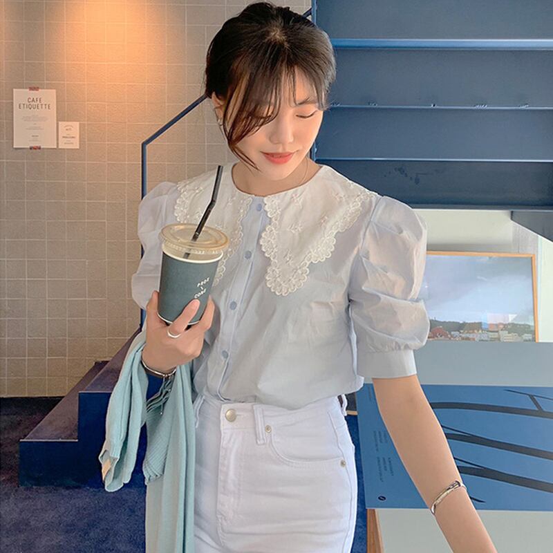 レース刺繍クロップトップスブルードールシャツレディースパフ半袖ブラウススリムシャツ ショート ハーフスリーブ asa92227102768