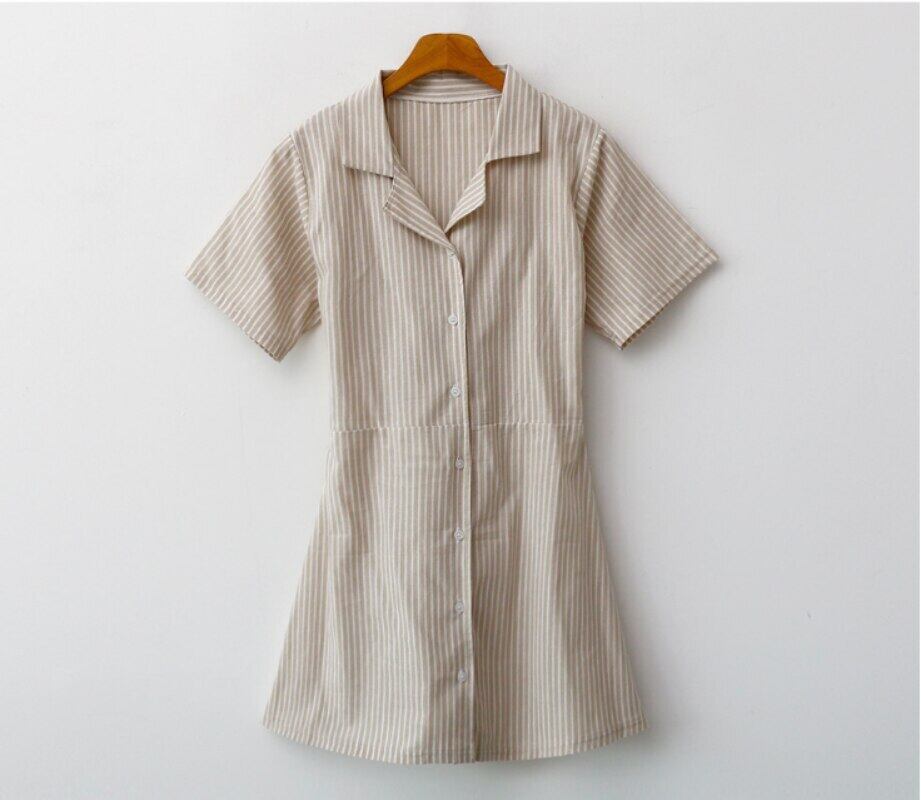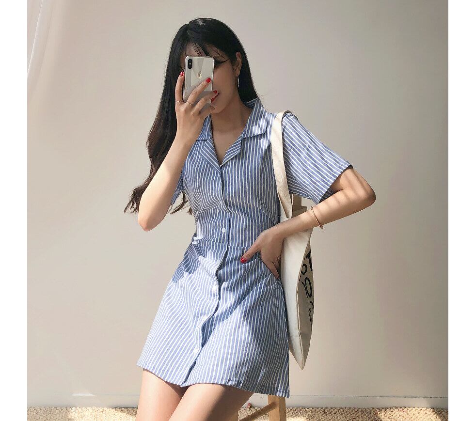 シングルブレスト半袖ミニレトロセクシーなノッチブルーストライプシャツドレス女性スリム Vestidos ヒップベルトウエスト ショート ハーフスリーブ ハーネス asa32426499211