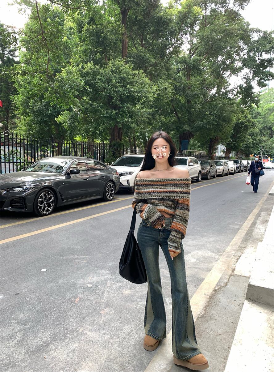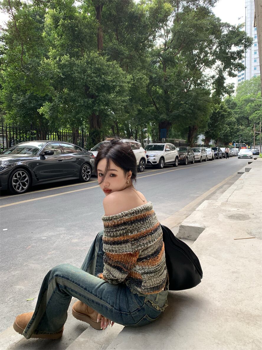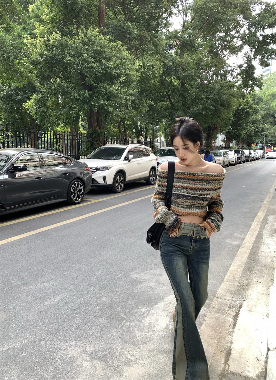 スリムスラッシュオフショルダーショートレインボーストライプセーター女性春セーター Y2k トップスニット絞り染めセーター スプリング 春物 asa54912575725