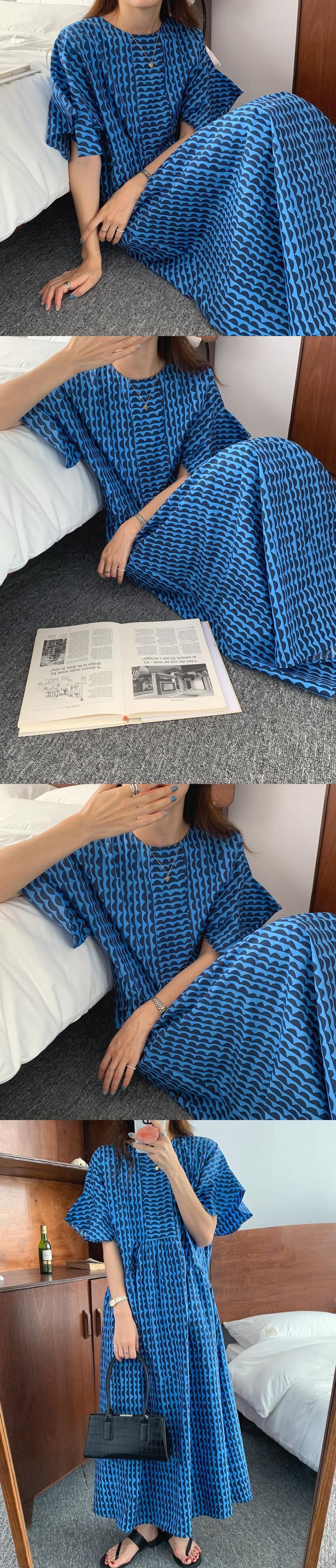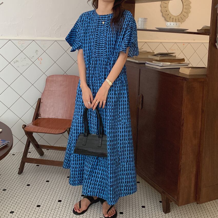 ドレス Vestidos デ ルーズ ウエスト ブルー フライング スリーブ O ネック ジオメトリック ストライプ ドレス レディース プリント Oネック asa31743577699