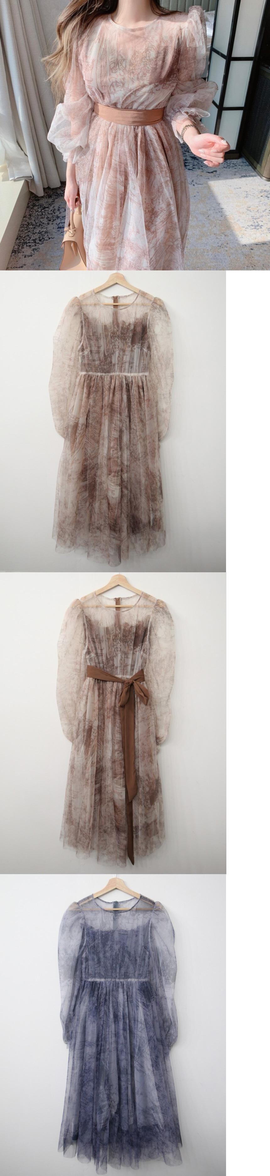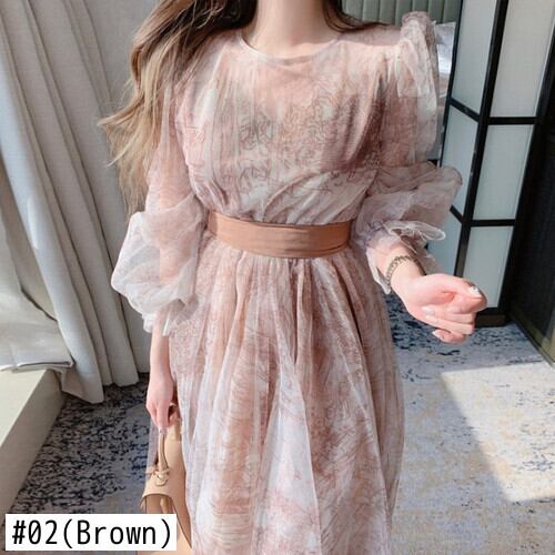 春甘いラウンドネックプリントパフスリーブウエストメッシュドレス女性透明インク Vestidos デホリデードレス 大人ガーリー スウィート キュート カジュアル スプリング 春物 Oネック asa83166250566