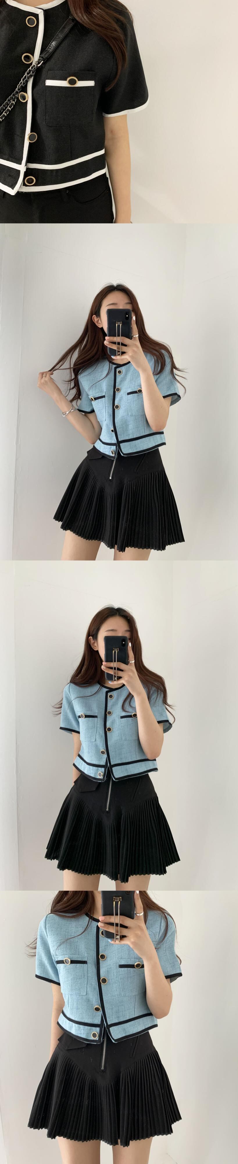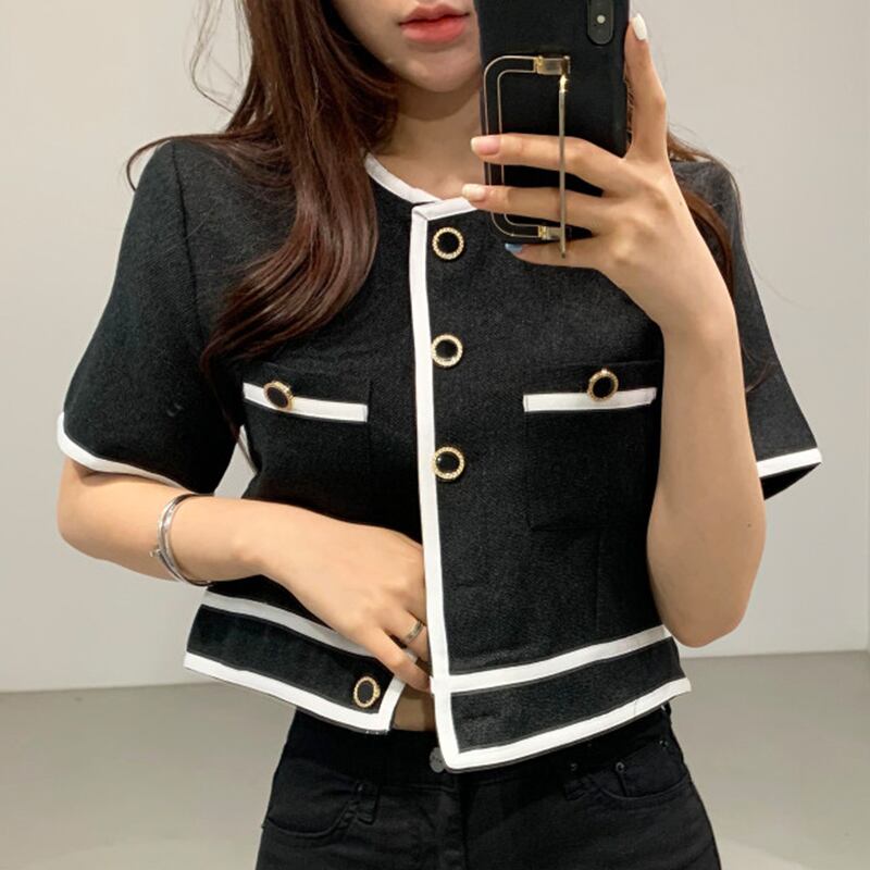 シックな夏薄いコントラスト O ネック半袖ジャケット女性クロップトップスシングルブレストストレートコート ショート ハーフスリーブ サマー 夏物 Oネック asa91367168754