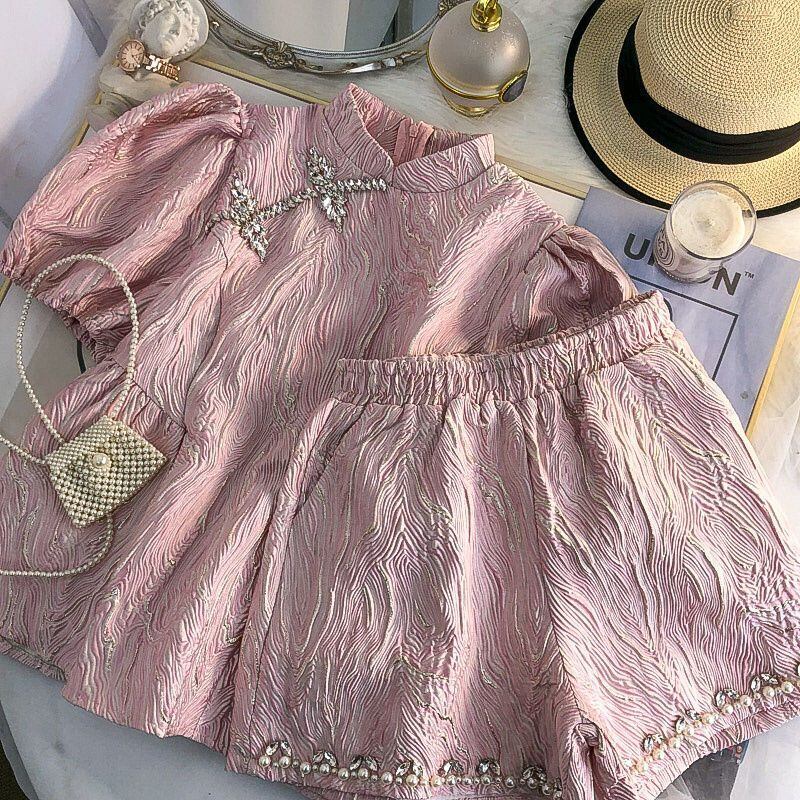 パフ半袖ラインストーンチャイナシャツ女性トップスワイドレッグショーツセット春ブラウスジャカードブラウス ショート ハーフスリーブ スプリング 春物 ブルマー ワイドパンツ asa16384890270