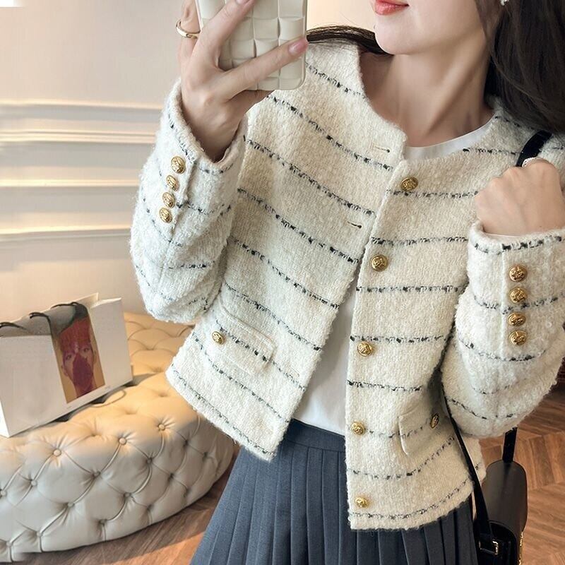 ブラックショートキルティングコート O ネックストライプジャケット女性ツイードカーディガンシックなスーツウールジャケット Jaquetas Oネック asa13107033349
