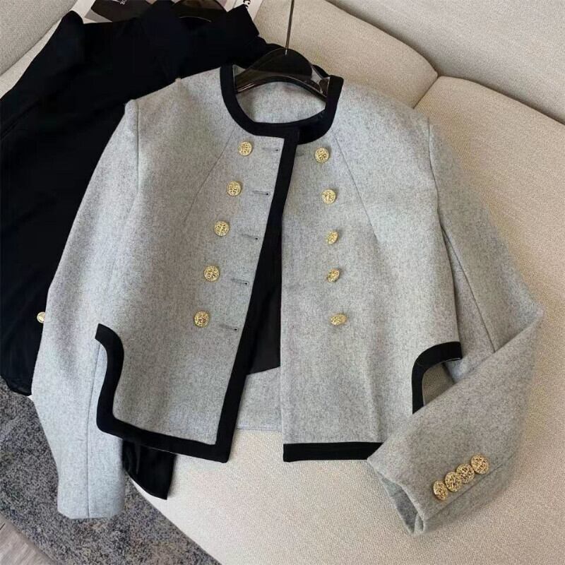 グレー ウール コート ショート 秋 シック ダブルブレスト イレギュラー ブレザー ジャケット Chaquetas Jaqueta スーツ オータム 秋物 asa23210180840
