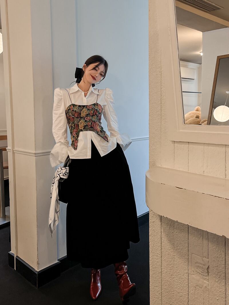 花刺繍キャミソール タンクトップ セクシーなパフ スリーブ シックなプリーツ ホワイト シャツ女性 2 点セット 花柄 asa60843472251