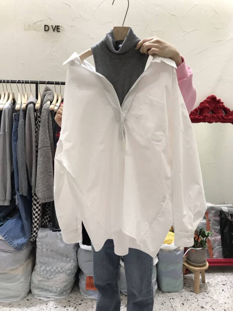 De Moda ネック フェイク ツーピース長袖シャツ レディース ホワイト ルーズ トップ オフショルダー ブラウス シャツ レディー ロング asa1096341268