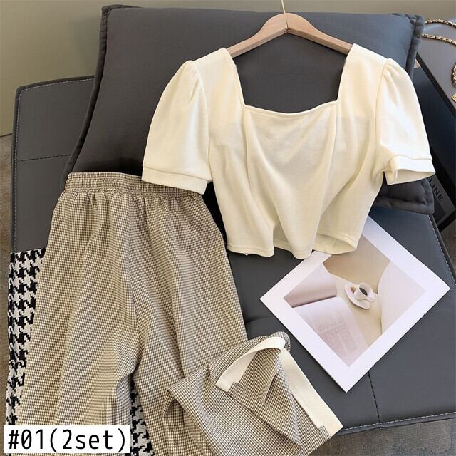 ワイドレッグスウェットパンツ千鳥格子パンツセットクロップトップススクエアブラウス半袖 Tシャツレトロチェック柄女性シャツ ショート ハーフスリーブ ワイドパンツ スクウェア asa60232444157