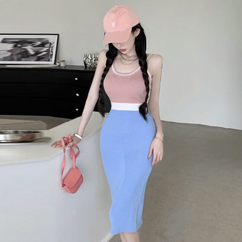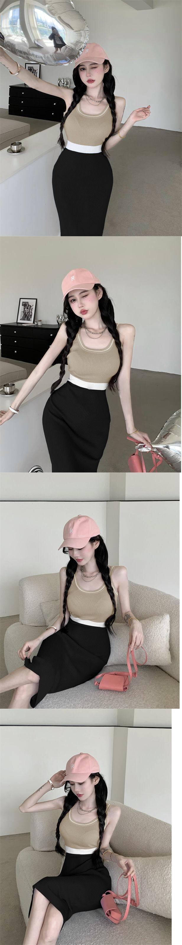 コントラストノースリーブサスペンダードレス女性スリムワイルドウエスト O ネック女性ニットドレスボディコンローブ Vestidos Oネック asa53878482134