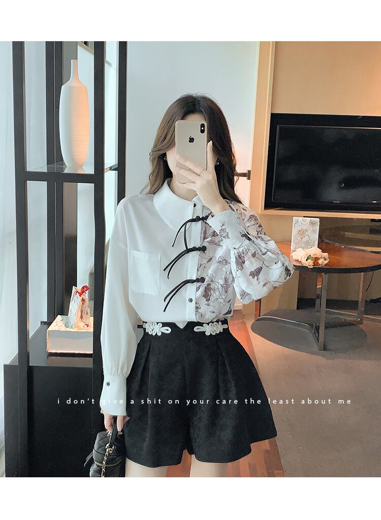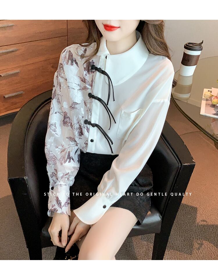 中国風のボタンレトロ長袖白シャツ女性シックなトップスデモーダ春の女性花柄ブラウス ロング ホワイト スプリング 春物 asa88559879721